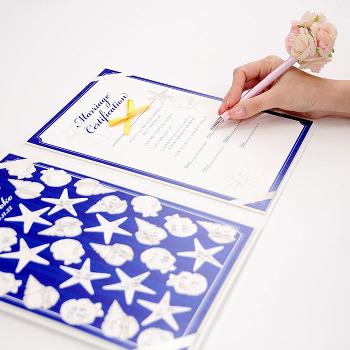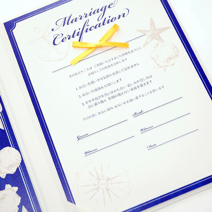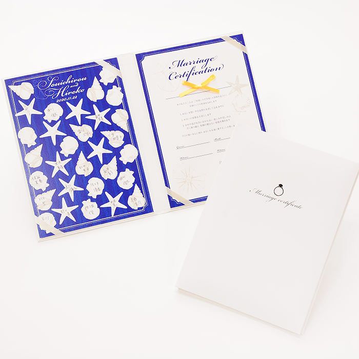 画像拡大 結婚証明書ゲスト参加型「マレーナネイビー」 (0) 商品番号 MC-marenanavy 販売価格 ¥ 9,130 税込 [ 83 ポイント進呈 ] 出荷の目安 通常 出荷予定 特急対応(有料) 出荷予定 +地域別の到着目安はこちら +商品制作にデータのご提出が必要な商品ですご注文からお届けまでの流れ 送料 商品合計 ¥15,000円以上送料無料(北海道、沖縄、一部地域除く) +地域別の送料はこちら 項目を指定してカートに入れる 商品についてのお問い合わせ 文章(宣言)(必須) 選択してください A B C D(通信欄に入力ください) 特急オプション(必須) 選択してください 希望しない→納期5営業日 希望する→納期3営業日(+¥2,200 税込) 新郎様のお名前(例 Tetsuya)(必須) ※ : / ~ などの半角記号は使用不可 新婦様のお名前(例 Kyoko)(必須) ※ : / ~ などの半角記号は使用不可 挙式日(例 20XX.11.22)(必須) ※ : / ~ などの半角記号は使用不可 お気に入り登録 1 2 3 4 5 6 7 8 9 10+ カートに入れる 閉じる × これと似た商品を見る 結婚証明書ゲスト参加型 マレーナネイビー ゲストにも参加いただく結婚の承認サイン。 人前式のお二人にピッタリの演出アイテムです。 結婚の宣言もお二人の言葉で入れれば 他にない、お二人だけのオリジナル結婚証明書になります。 右面:メッセージの文章タイプ(定型文またはオリジナル文) A We promise to be husband and wife before these witnesses here present. We swear to admire, love and help each other and to create a peaceful happy family. B 私たちは 今日ここにお集まりくださった 皆様の前で 生涯かわることなく お互いをいたわり合い 助け合い 楽しいことも 苦しいことも 二人で分かち合って 平和で幸せに満ちた 明るい家庭を築くことを誓います C 本日私たち二人は ご列席いただきました皆様を証人とし 夫婦としての約束を交わします 1.お互いを想いやる気持ちを決して忘れません 2.お互いの家族も大切にします 3.幸せや喜びを共に分かち合い 悲しみや苦しみは共に乗り越え 笑顔の絶えない家庭を築きます 今日の誓いを心に刻み お互いを永遠に愛することを誓います Dオリジナル オリジナル文章(200文字以内)※注文書の通信欄またはメールにご記入下さい ※オリジナル文章の句読点はデザインによりスペース等にさせていただく場合もございます ◆式に間に合わない! そんな方はこちら 結婚式に間に合わない…そんな方もご安心ください。ご注文時に特急オプション「希望する」をお選びの上、ご注文いただくとスピード対応いたします。※別途特急オプション料金が加算されます。 お届けの内容 結婚証明書…ホワイト1冊 証明シート(本人記帳用)…1枚 証明シート(ゲスト記帳用)…2枚 サイズ カバーサイズ197mm×266mm シートサイズ182mm×257mm 納期 5営業日(土日祝のぞく) 特急オプション「希望する」の場合は3営業日(土日祝のぞく) ※ただし、お支払いが銀行振込の場合はご入金確認後の手配となります お支払い方法 名入れ商品につき「代金引換」はお選びいただけません 関連商品の ご案内 写真追加プションお好きな写真を1点追加できます ゲスト参加型婚証明書専用ゲスト署名欄追加オプション レビューを書く