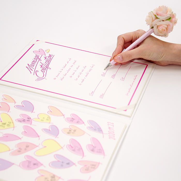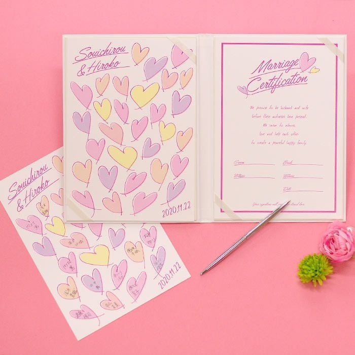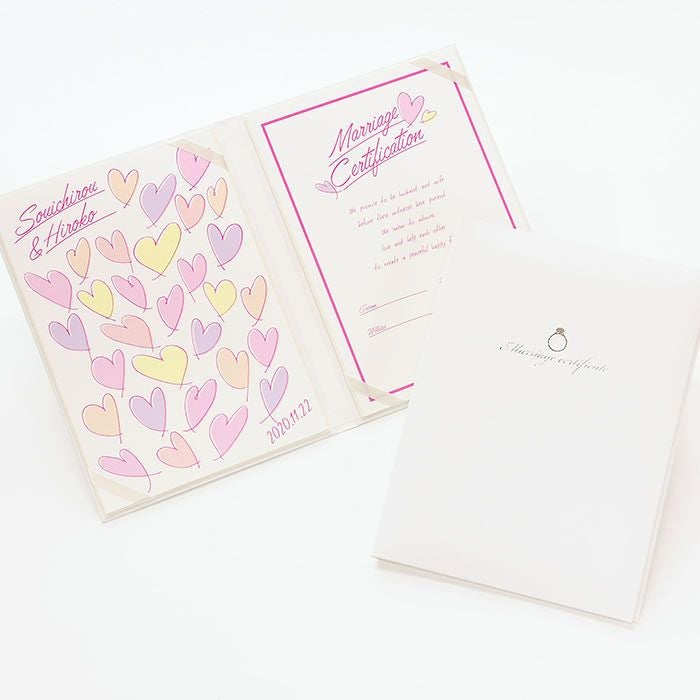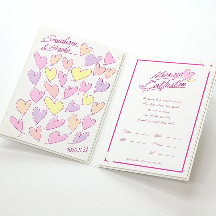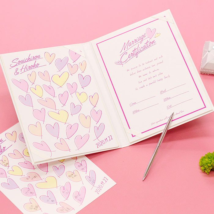 画像拡大 結婚証明書ゲスト参加型「ラッシュハート ピンク」 (0) 商品番号 MC-rushheartpink 販売価格 ¥ 9,130 税込 [ 83 ポイント進呈 ] 出荷の目安 通常 出荷予定 特急対応(有料) 出荷予定 +地域別の到着目安はこちら +商品制作にデータのご提出が必要な商品ですご注文からお届けまでの流れ 送料 商品合計 ¥15,000円以上送料無料(北海道、沖縄、一部地域除く) +地域別の送料はこちら 項目を指定してカートに入れる 商品についてのお問い合わせ 文章(宣言)(必須) 選択してください A B C D(通信欄に入力ください) 特急オプション(必須) 選択してください 希望しない→納期5営業日 希望する→納期3営業日(+¥2,200 税込) 新郎様のお名前(例 Tetsuya)(必須) ※ : / ~ などの半角記号は使用不可 新婦様のお名前(例 Kyoko)(必須) ※ : / ~ などの半角記号は使用不可 挙式日(例 20XX.11.22)(必須) ※ : / ~ などの半角記号は使用不可 お気に入り登録 1 2 3 4 5 6 7 8 9 10+ カートに入れる 閉じる × これと似た商品を見る 結婚証明書ゲスト参加型 ラッシュハート ピンク ゲストにも参加いただく結婚の承認サイン。 人前式のお二人にピッタリの演出アイテムです。 結婚の宣言もお二人の言葉で入れれば 他にない、お二人だけのオリジナル結婚証明書になります。 右面:メッセージの文章タイプ(定型文またはオリジナル文) A We promise to be husband and wife before these witnesses here present. We swear to admire, love and help each other and to create a peaceful happy family. B 私たちは 今日ここにお集まりくださった 皆様の前で 生涯かわることなく お互いをいたわり合い 助け合い 楽しいことも 苦しいことも 二人で分かち合って 平和で幸せに満ちた 明るい家庭を築くことを誓います C 本日私たち二人は ご列席いただきました皆様を証人とし 夫婦としての約束を交わします 1.お互いを想いやる気持ちを決して忘れません 2.お互いの家族も大切にします 3.幸せや喜びを共に分かち合い 悲しみや苦しみは共に乗り越え 笑顔の絶えない家庭を築きます 今日の誓いを心に刻み お互いを永遠に愛することを誓います Dオリジナル オリジナル文章(200文字以内)※注文書の通信欄またはメールにご記入下さい ※オリジナル文章の句読点はデザインによりスペース等にさせていただく場合もございます ◆式に間に合わない! そんな方はこちら 結婚式に間に合わない…そんな方もご安心ください。ご注文時に特急オプション「希望する」をお選びの上、ご注文いただくとスピード対応いたします。※別途特急オプション料金が加算されます。 お届けの内容 結婚証明書…ホワイト1冊 証明シート(本人記帳用)…1枚 証明シート(ゲスト記帳用)…2枚 サイズ カバーサイズ197mm×266mm シートサイズ182mm×257mm 納期 5営業日(土日祝のぞく) 特急オプション「希望する」の場合は3営業日(土日祝のぞく) ※ただし、お支払いが銀行振込の場合はご入金確認後の手配となります お支払い方法 名入れ商品につき「代金引換」はお選びいただけません 関連商品の ご案内 写真追加プション お好きな写真を 1点追加できます ゲスト参加型婚証明書専用 ゲスト署名欄 追加オプション レビューを書く