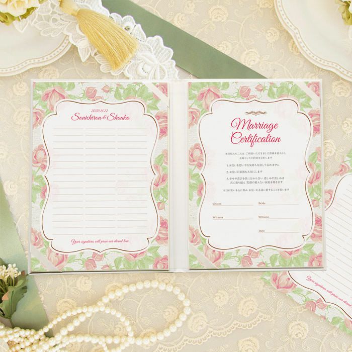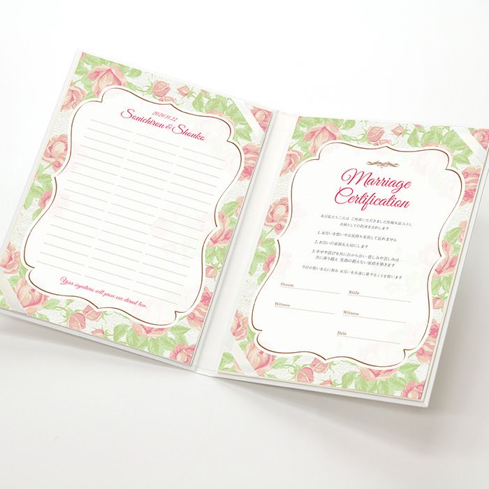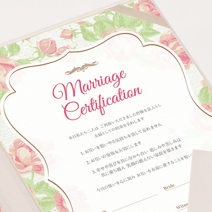 画像拡大 結婚証明書ゲスト参加型「フィオーレ」 (0) 商品番号 MC-fiore 販売価格 ¥ 9,130 税込 [ 83 ポイント進呈 ] 出荷の目安 通常 出荷予定 特急対応(有料) 出荷予定 +地域別の到着目安はこちら +商品制作にデータのご提出が必要な商品ですご注文からお届けまでの流れ 送料 商品合計 ¥15,000円以上送料無料(北海道、沖縄、一部地域除く) +地域別の送料はこちら 項目を指定してカートに入れる 商品についてのお問い合わせ 文章(宣言)(必須) 選択してください A B C D(通信欄に入力ください) 特急オプション(必須) 選択してください 希望しない→納期5営業日 希望する→納期3営業日(+¥2,200 税込) 新郎様のお名前(例 Tetsuya)(必須) ※ : / ~ などの半角記号は使用不可 新婦様のお名前(例 Kyoko)(必須) ※ : / ~ などの半角記号は使用不可 挙式日(例 20XX.11.22)(必須) ※ : / ~ などの半角記号は使用不可 お気に入り登録 1 2 3 4 5 6 7 8 9 10+ カートに入れる 閉じる × これと似た商品を見る 結婚証明書ゲスト参加型 フィオーレ ゲスト参加型の人前式タイプの結婚証明書はテーマウェディングにぴったりの演出アイテムです。 結婚の宣言もお二人の言葉で入れれば 他にない、お二人だけのオリジナル結婚証明書になります。 右面:メッセージの文章タイプ(定型文またはオリジナル文) A We promise to be husband and wife before these witnesses here present. We swear to admire, love and help each other and to create a peaceful happy family. B 私たちは 今日ここにお集まりくださった 皆様の前で 生涯かわることなく お互いをいたわり合い 助け合い 楽しいことも 苦しいことも 二人で分かち合って 平和で幸せに満ちた 明るい家庭を築くことを誓います C 本日私たち二人は ご列席いただきました皆様を証人とし 夫婦としての約束を交わします 1.お互いを想いやる気持ちを決して忘れません 2.お互いの家族も大切にします 3.幸せや喜びを共に分かち合い 悲しみや苦しみは共に乗り越え 笑顔の絶えない家庭を築きます 今日の誓いを心に刻み お互いを永遠に愛することを誓います Dオリジナル オリジナル文章(200文字以内)※注文書の通信欄またはメールにご記入下さい ※オリジナル文章の句読点はデザインによりスペース等にさせていただく場合もございます ◆式に間に合わない! そんな方はこちら 結婚式に間に合わない…そんな方もご安心ください。ご注文時に特急オプション「希望する」をお選びの上、ご注文いただくとスピード対応いたします。※別途特急オプション料金が加算されます。 お届けの内容 結婚証明書…ホワイト1冊 証明シート(本人記帳用)…1枚 証明シート(ゲスト記帳用102名まで対応)…2枚 サイズ カバーサイズ197mm×266mm シートサイズ182mm×257mm 納期 5営業日(土日祝のぞく) 特急オプション「希望する」の場合は3営業日(土日祝のぞく) ※ただし、お支払いが銀行振込の場合はご入金確認後の手配となります お支払い方法 名入れ商品につき「代金引換」はお選びいただけません 関連商品の ご案内 写真追加プションお好きな写真を1点追加できます ゲスト参加型婚証明書専用ゲスト署名欄追加オプション レビューを書く