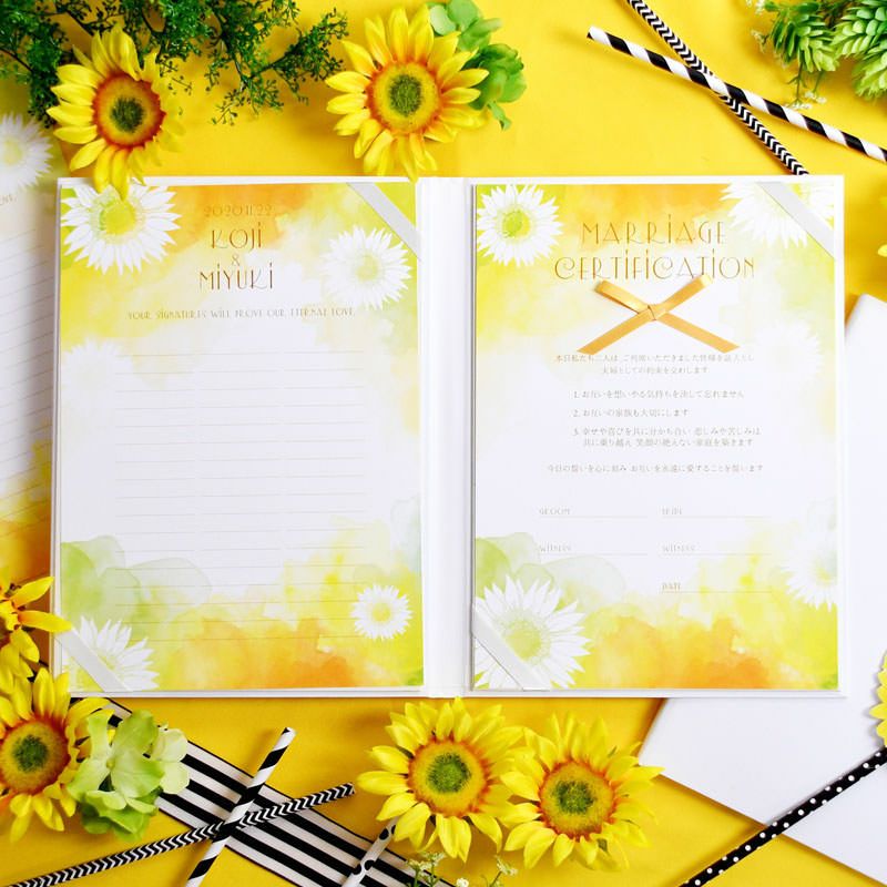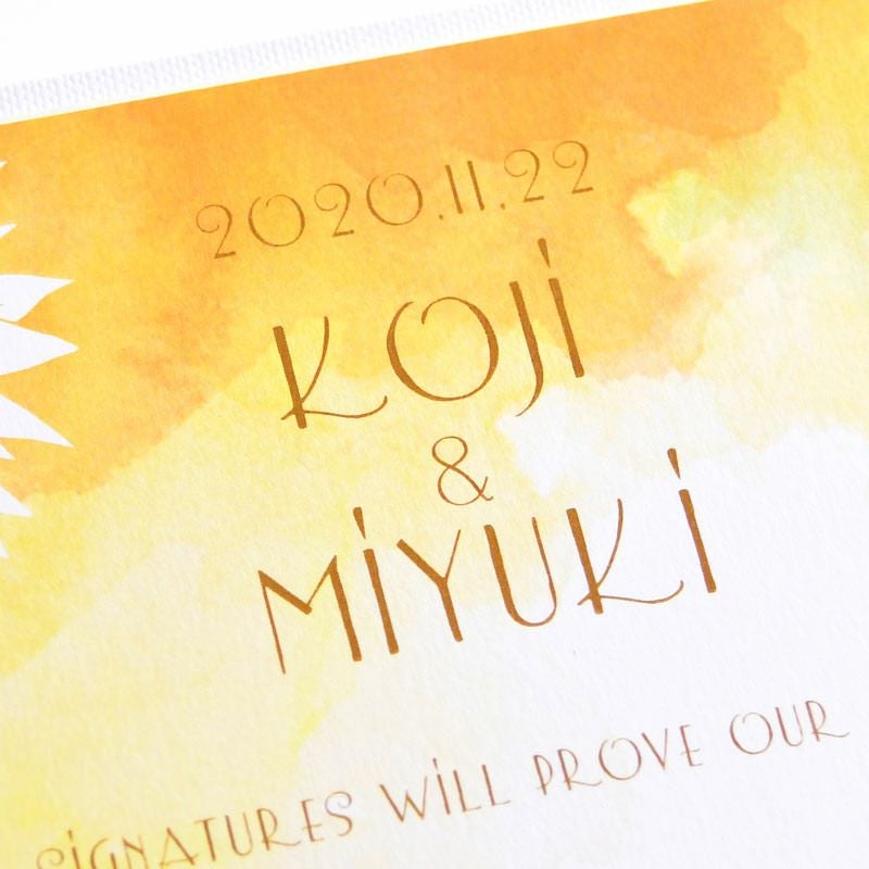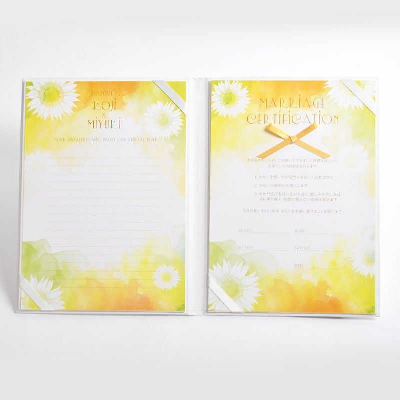 画像拡大 【夏挙式】結婚証明書ゲスト参加型「ロッティサマー」(50~100名用) (0) 商品番号 mc-rottisum 販売価格 ¥ 9,130 税込 [ 83 ポイント進呈 ] 出荷の目安 通常 出荷予定 特急対応(有料) 出荷予定 +地域別の到着目安はこちら +商品制作にデータのご提出が必要な商品ですご注文からお届けまでの流れ 送料 商品合計 ¥15,000円以上送料無料(北海道、沖縄、一部地域除く) +地域別の送料はこちら 項目を指定してカートに入れる 商品についてのお問い合わせ 文章(宣言)(必須) 選択してください A B C D(通信欄に入力ください) 特急オプション(必須) 選択してください 希望しない→納期5営業日 希望する→納期3営業日(+¥2,200 税込) 新郎様のお名前(例 Tetsuya)(必須) ※ : / ~ などの半角記号は使用不可 新婦様のお名前(例 Kyoko)(必須) ※ : / ~ などの半角記号は使用不可 挙式日(例 20XX.11.22)(必須) ※ : / ~ などの半角記号は使用不可 お気に入り登録 1 2 3 4 5 6 7 8 9 10+ カートに入れる 閉じる × これと似た商品を見る 結婚証明書ゲスト参加型「ロッティサマー」 ◆テーマウェディングにぴったりなゲスト参加型のおしゃれな結婚証明書 ゲスト参加型の人前式タイプの結婚証明書はテーマウェディングにぴったりの演出アイテムです。 結婚の宣言もお二人の言葉で入れれば 他にない、お二人だけのオリジナル結婚証明書になります。 ◆世界でひとつの結婚証明書 新郎新婦のお名前と挙式日を入れた世界にたったひとつの特別な結婚証明書。ゲストが署名をして結婚式に参加できる人前式タイプです。宣誓文はオリジナルの文章にも変更可能! ◆イラスト部分にゲストの署名をもらおう 一冊で102名までゲストの署名が可能!(シート1枚51名の署名欄×2枚)さらに多い場合も追加シートを購入可能です。さらに写真追加オプションでお二人のお写真をお入れして制作することも可能です。 右面:メッセージの文章タイプ(定型文またはオリジナル文) A We promise to be husband and wife before these witnesses here present. We swear to admire, love and help each other and to create a peaceful happy family. B 私たちは 今日ここにお集まりくださった 皆様の前で 生涯かわることなく お互いをいたわり合い 助け合い 楽しいことも 苦しいことも 二人で分かち合って 平和で幸せに満ちた 明るい家庭を築くことを誓います C 本日私たち二人は ご列席いただきました皆様を証人とし 夫婦としての約束を交わします 1.お互いを想いやる気持ちを決して忘れません 2.お互いの家族も大切にします 3.幸せや喜びを共に分かち合い 悲しみや苦しみは共に乗り越え 笑顔の絶えない家庭を築きます 今日の誓いを心に刻み お互いを永遠に愛することを誓います Dオリジナル オリジナル文章(200文字以内)※注文書の通信欄またはメールにご記入下さい ※オリジナル文章の句読点はデザインによりスペース等にさせていただく場合もございます ◆式に間に合わない! そんな方はこちら 結婚式に間に合わない…そんな方もご安心ください。ご注文時に特急オプション「希望する」をお選びの上、ご注文いただくとスピード対応いたします。※別途特急オプション料金が加算されます。 お届けの内容 結婚証明書…ホワイト1冊 証明シート(本人記帳用)…1枚 証明シート(ゲスト記帳用)…2枚 サイズ カバーサイズ197mm×266mm シートサイズ182mm×257mm 納期 5営業日(土日祝のぞく) 特急オプション「希望する」の場合は3営業日(土日祝のぞく) ※ただし、お支払いが銀行振込の場合はご入金確認後の手配となります お支払い方法 名入れ商品につき「代金引換」はお選びいただけません 関連商品の ご案内 写真追加プションお好きな写真を1点追加できます ゲスト参加型婚証明書専用ゲスト署名欄追加オプション レビューを書く