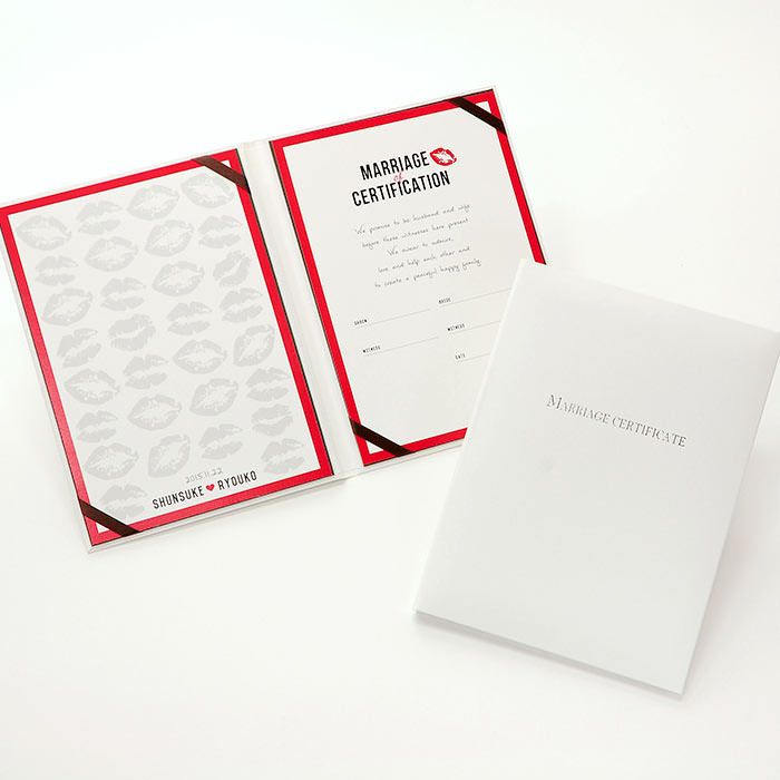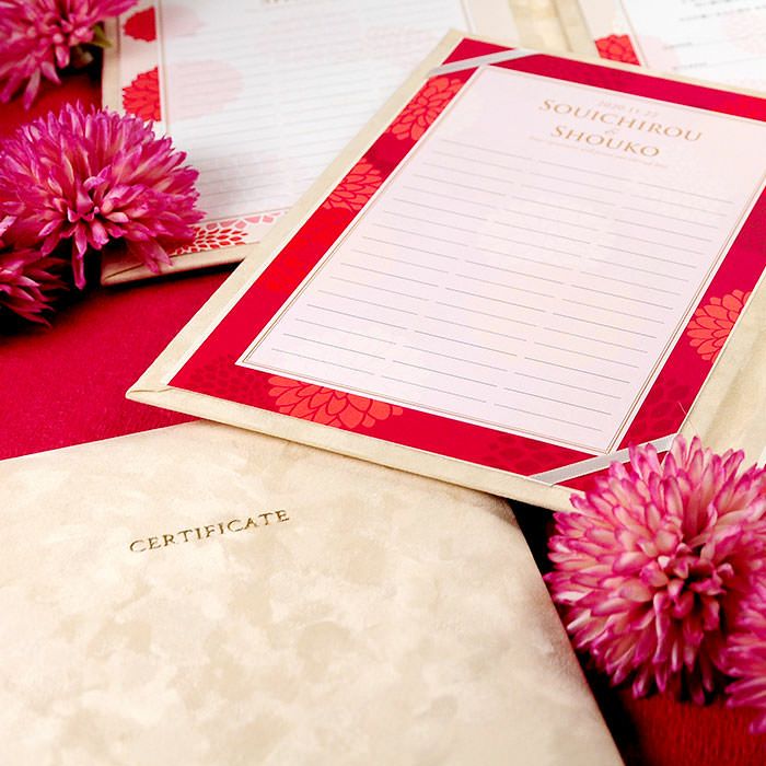 他の画像を見る 結婚証明書ゲスト参加型「ジュリア紅」/人前式 (0) 販売価格 ¥ 9,130 税込 商品について 閉じる 鮮やかな紅色が華やかなデザインのゲスト参加型の結婚証明書。ゲストがサインをすることで、二人の誓いを見守る大切な証となります。誓いの言葉は定型文から選べるほか、オリジナルの宣誓文で作成可能なので、二人だけの特別な誓いを形にできます。100名様までゲストの署名が可能。オプションでお写真を入れることも可能です。 詳細を見る お気に入り登録