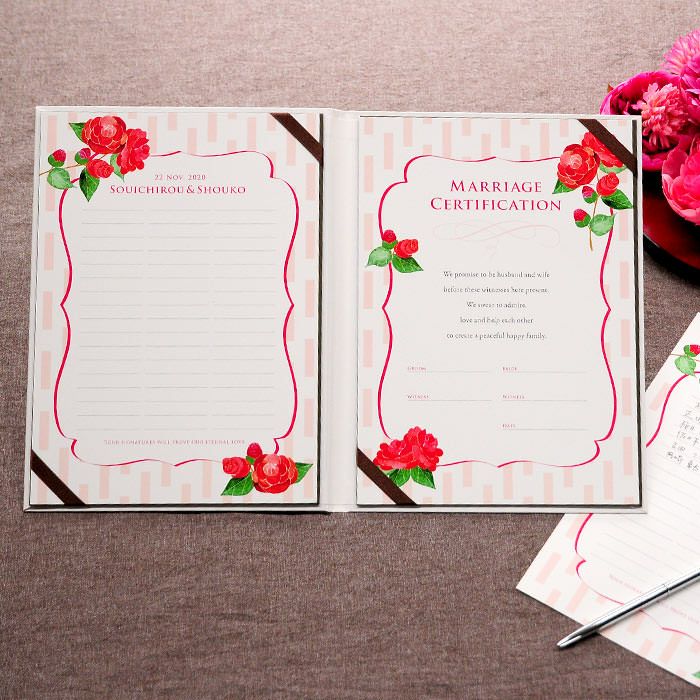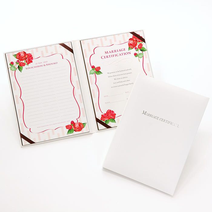 画像拡大 結婚証明書ゲスト参加型「つばき(51~102名様用)」 (0) 商品番号 MC-camellia 販売価格 ¥ 9,130 税込 [ 83 ポイント進呈 ] 出荷の目安 通常 出荷予定 特急対応(有料) 出荷予定 +地域別の到着目安はこちら +商品制作にデータのご提出が必要な商品ですご注文からお届けまでの流れ 送料 商品合計 ¥15,000円以上送料無料(北海道、沖縄、一部地域除く) +地域別の送料はこちら 項目を指定してカートに入れる 商品についてのお問い合わせ 文章(宣言)(必須) 選択してください A B C D(通信欄に入力ください) 特急オプション(必須) 選択してください 希望しない→納期5営業日 希望する→納期3営業日(+¥2,200 税込) 新郎様のお名前(例 Tetsuya)(必須) ※ : / ~ などの半角記号は使用不可 新婦様のお名前(例 Kyoko)(必須) ※ : / ~ などの半角記号は使用不可 挙式日(例 20XX.11.22)(必須) ※ : / ~ などの半角記号は使用不可 お気に入り登録 1 2 3 4 5 6 7 8 9 10+ カートに入れる 閉じる × これと似た商品を見る 結婚証明書ゲスト参加型 つばき ゲストにも参加いただく結婚の承認サイン。 人前式のお二人にピッタリの演出アイテムです。 結婚の宣言もお二人の言葉で入れれば 他にない、お二人だけのオリジナル結婚証明書になります。 右面:メッセージの文章タイプ(定型文またはオリジナル文) A We promise to be husband and wife before these witnesses here present. We swear to admire, love and help each other and to create a peaceful happy family. B 私たちは 今日ここにお集まりくださった 皆様の前で 生涯かわることなく お互いをいたわり合い 助け合い 楽しいことも 苦しいことも 二人で分かち合って 平和で幸せに満ちた 明るい家庭を築くことを誓います C 本日私たち二人は ご列席いただきました皆様を証人とし 夫婦としての約束を交わします 1.お互いを想いやる気持ちを決して忘れません 2.お互いの家族も大切にします 3.幸せや喜びを共に分かち合い 悲しみや苦しみは共に乗り越え 笑顔の絶えない家庭を築きます 今日の誓いを心に刻み お互いを永遠に愛することを誓います Dオリジナル オリジナル文章(200文字以内)※注文書の通信欄またはメールにご記入下さい ※オリジナル文章の句読点はデザインによりスペース等にさせていただく場合もございます ◆式に間に合わない! そんな方はこちら 結婚式に間に合わない…そんな方もご安心ください。ご注文時に特急オプション「希望する」をお選びの上、ご注文いただくとスピード対応いたします。※別途特急オプション料金が加算されます。 お届けの内容 結婚証明書…ホワイト1冊 証明シート(本人記帳用)…1枚 証明シート(ゲスト記帳用)…2枚 サイズ カバーサイズ197mm×266mm シートサイズ182mm×257mm 納期 5営業日(土日祝のぞく) 特急オプション「希望する」の場合は3営業日(土日祝のぞく) ※ただし、お支払いが銀行振込の場合はご入金確認後の手配となります お支払い方法 名入れ商品につき「代金引換」はお選びいただけません 関連商品の ご案内 写真追加プションお好きな写真を1点追加できます ゲスト参加型婚証明書専用ゲスト署名欄追加オプション レビューを書く