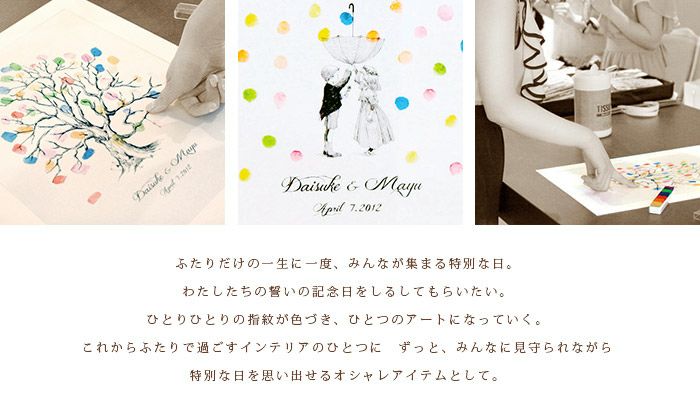 他の画像を見る 別配送A商品のみ同時購入可 ウェディングツリー Sサイズ Marca ウェルカムボード 【別配送A】 (0) 販売価格 ¥ 18,480 税込 商品について 閉じる ゲストの方に指紋を押していただいて完成するウェルカムボード兼結婚証明書。対応人数 は約30~80名様。5種類のアート×2色のフレームから組み合わせを自由にチョイスすることで結婚式の後でもおふたりのこれからの住まいのインテリアコーディネイトに似合うオシャレなボードを作成することができます。ゲストひとりひとりの指紋が色づき、まるでひとつのアートになっていくようなウェディングツリー結婚証明書です。 詳細を見る お気に入り登録