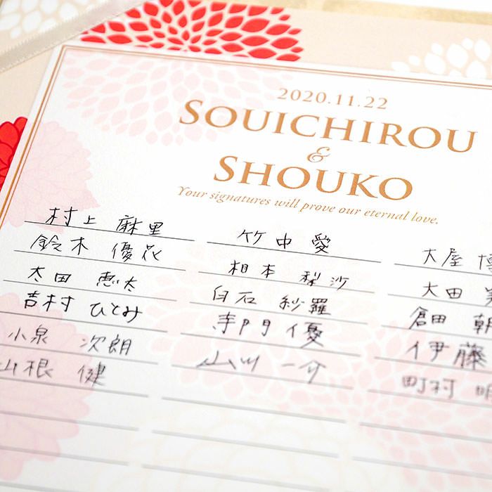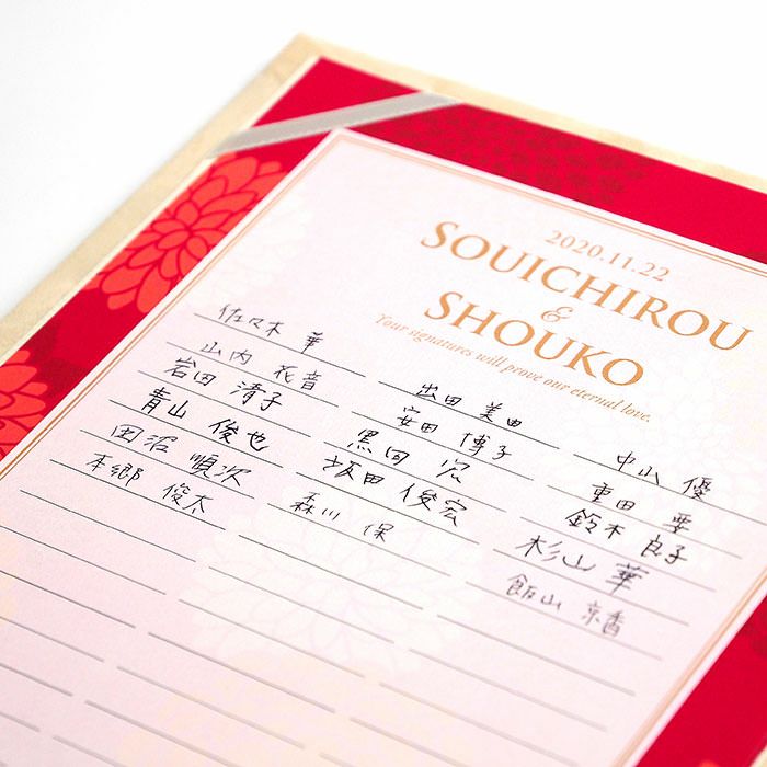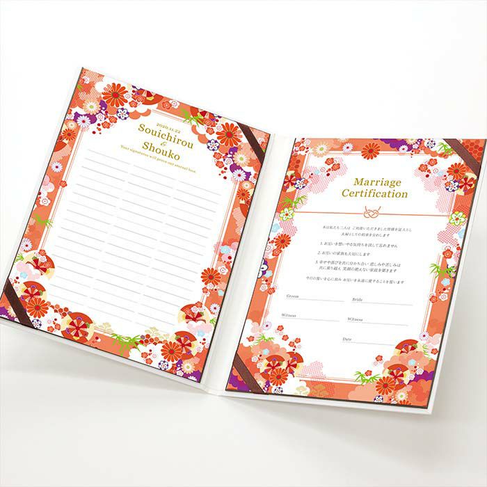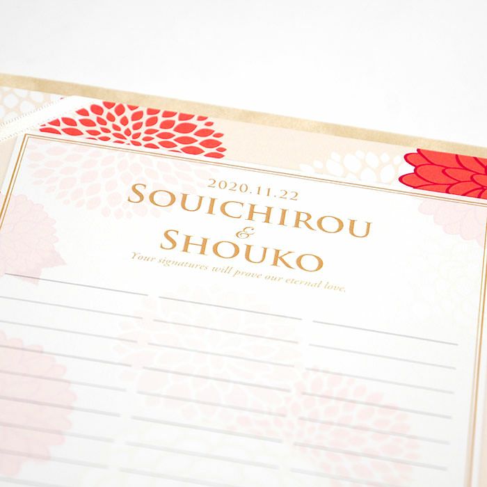 他の画像を見る 芳名帳としても使える! <少人数専用>ゲスト参加型結婚証明書「春日」 5.00 (2) 販売価格 ¥ 6,600 税込 商品について 閉じる 少人数の結婚式のためのゲスト参加型結婚証明書。華やかで優雅な和のデザインが心温まる挙式の雰囲気を一層引き立てます。署名欄には特別な工夫が施されており、家族婚、少人数婚のよくあるお悩みを解決。芳名帳を兼用したり寄せ書きしたりアイデア次第でいろんな使い方ができます。宣誓文はオリジナルの内容にカスタマイズ可能で、お二人だけの特別な誓いを形にできます。 詳細を見る お気に入り登録