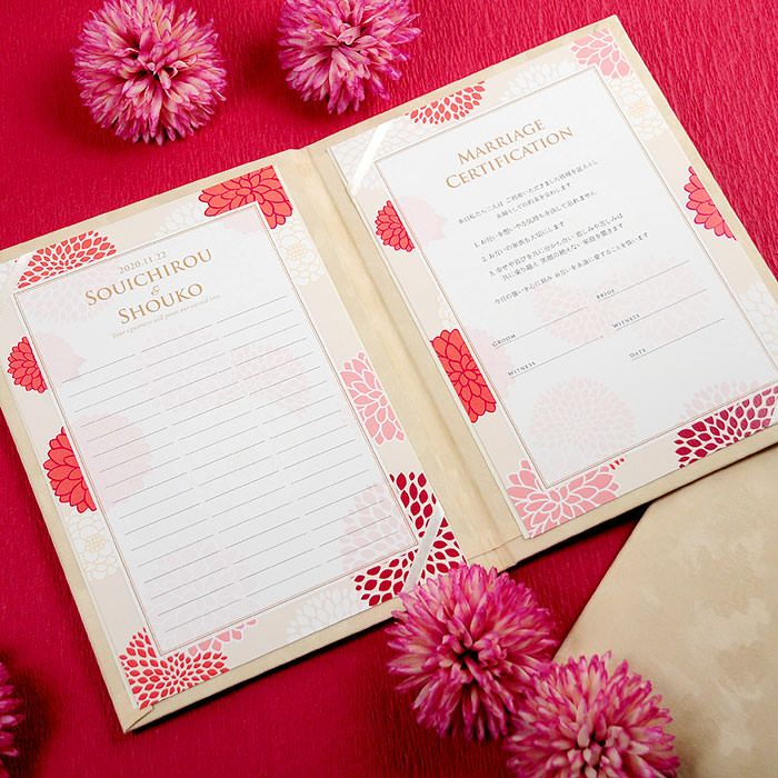 他の画像を見る 結婚証明書ゲスト参加型「ジュリア紅」/人前式 (0) 販売価格 ¥ 9,130 税込 商品について 閉じる 鮮やかな紅色が華やかなデザインのゲスト参加型の結婚証明書。ゲストがサインをすることで、二人の誓いを見守る大切な証となります。誓いの言葉は定型文から選べるほか、オリジナルの宣誓文で作成可能なので、二人だけの特別な誓いを形にできます。100名様までゲストの署名が可能。オプションでお写真を入れることも可能です。 詳細を見る お気に入り登録