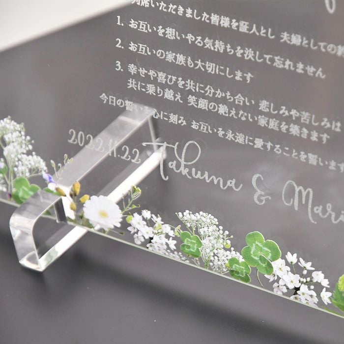 画像拡大 クリアガラス結婚証明書「グリーンフロレット」 5.00 (1) 商品番号 MCG-greenfloret 販売価格 ¥ 13,200 税込 [ 120 ポイント進呈 ] 出荷の目安 通常 出荷予定 特急対応(有料) 出荷予定 +地域別の到着目安はこちら +商品制作にデータのご提出が必要な商品ですご注文からお届けまでの流れ 送料 商品合計 ¥15,000円以上送料無料(北海道、沖縄、一部地域除く) +地域別の送料はこちら 項目を指定してカートに入れる 商品についてのお問い合わせ 文章(宣言)(必須) 選択してください A B C D(オリジナル文→通信欄にご記入ください) 通信欄はカートに入れた後、ご注文手続き画面の最後のページにあります。 署名タイプ(必須) 選択してください 刻印タイプ(挙式日・お名前を レーザー彫刻済み) 手書きタイプ(挙式日・お名前の署名欄あり) 特急オプション(必須) 選択してください 希望しない→納期10営業日 希望する→納期5営業日(+¥2,200 税込) 校正(お客様による制作前データ確認)(必須) 選択してください 希望しない 希望する(+¥1,650 税込) 新郎様のお名前(例 Tetsuya)(必須) ※ : / ~ などの半角記号は使用不可 新婦様のお名前(例 Kyoko)(必須) ※ : / ~ などの半角記号は使用不可 挙式日(例 20XX.11.22)(必須) ※ : / ~ などの半角記号は使用不可 お気に入り登録 1 2 3 4 5 6 7 8 9 10+ カートに入れる 閉じる × これと似た商品を見る ガラスの結婚証明書 グリーンフロレット 人前式を選ぶなら結婚証明書にこだわりませんか?ガーデンウェディングやナチュラルウェディングにぴったりなオリジナルグラフィックデザインを施したクリアガラスの結婚証明書の登場です。 透明感が美しい♡ガラスの結婚証明書 クリアガラスに繊細な彫刻で文字を刻んだ美しい結婚証明書。明るくみずみずしい植物柄をあしらってナチュラル感たっぷりに。 ガラスに映えるナチュラルデザイン クローバーやガーベラ、カスミソウなどの可憐でナチュラルなデザインをUV印刷でほどこしました。たくさんの四つ葉のクローバーが幸せのお守りになりそう♡ ふたりだけの 誓いの言葉を刻印できる ガラスには、おふたりのお名前と挙式日、誓いの言葉をご注文後1つずつ丁寧に彫刻させていただきます。誓いの言葉はおふたりだけのオリジナル文でも追加料金なしで作成可能です。 文章タイプ(定型文またはオリジナル文) A We promise to be husband and wife before these witnesses here present. We swear to admire, love and help each other and to create a peaceful happy family. B 私たちは 今日ここにお集まりくださった 皆様の前で 生涯かわることなく お互いをいたわり合い 助け合い 楽しいことも 苦しいことも 二人で分かち合って 平和で幸せに満ちた 明るい家庭を築くことを誓います C 本日私たち二人は ご列席いただきました皆様を証人とし 夫婦としての約束を交わします 1.お互いを想いやる気持ちを決して忘れません 2.お互いの家族も大切にします 3.幸せや喜びを共に分かち合い 悲しみや苦しみは共に乗り越え笑顔の絶えない家庭を築きます 今日の誓いを心に刻み お互いを永遠に愛することを誓います D オリジナル文章(200文字以内)※通信欄にご記入下さい ※オリジナル文章の句読点はデザインによりスペース等にさせていただく場合もございます すぐ真似できる!結婚証明書文例まとめ 誓いの言葉を いつもそばに飾って… 高級感のあるアクリル製のスタンドにセットして飾りやすさだけでなく、飾ったときの美しさにもこだわりました。インテリアとしても見映えするからいつも目に見える場所に飾っておける結婚証明書です。ガラスならではのいつまでも綺麗な透明感と、消えることのないレーザー刻印の誓いの言葉はおふたりの一生の宝物に♡ 誓いの言葉を飾れる♡ガラスの結婚証明書 選べる署名タイプ 挙式日・お名前もUV印刷する「刻印タイプ」と、当日ご自身で署名する「手書きタイプ」がお選びいただけます。挙式スタイルにあわせてお選びください。 1.刻印タイプ 挙式日・お名前をおしゃれなフォントでレーザー刻印。一生の宝物だからより美しく残したいという方におススメです。 2.手書きタイプ 挙式日・お名前の記入欄があります。当日ご自身で署名したいという方はこちらのタイプを。署名には、ポスカなどの白ペンがおススメです。 使ったペンはこれ!白ペンで書いた感想 式に間に合わない!そんな方はこちら 挙式に間に合わない…そんな方もご安心ください。ご注文時に特急オプション「希望する」をお選びの上、ご注文いただくとスピード対応いたします。※別途特急オプション料金が加算されます。 オプションで 事前チェックも可能 レイアウトや文字バランスなどどのように仕上がるのか事前に確認したい方は、ご注文時に校正(お客様による制作前データ確認)「希望する」をお選びいただきご注文くださいませ。校正データはPDFで確認できるからスマホでチェックも出来ます。※別途オプション料金が加算されます。 お客様の声 卒花さんのリアル結婚式でのエピソードをご紹介させていただ