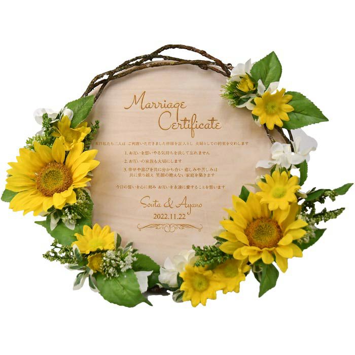 画像拡大 数量限定 限定!ひまわりアレンジ 結婚証明書 木製レーザー刻印 限定アレンジ「ひまわり」 (0) 商品番号 mcw-wreath-himawari 販売価格 ¥ 15,400 税込 [ 140 ポイント進呈 ] 出荷の目安 ご注文後すぐ素材を提出いただいた場合 通常 出荷予定 特急対応(有料) 出荷予定 +地域別の到着目安はこちら +商品制作にデータのご提出が必要な商品ですご注文からお届けまでの流れ 送料 商品合計 ¥15,000円以上送料無料(北海道、沖縄、一部地域除く) +地域別の送料はこちら 項目を指定してカートに入れる 商品についてのお問い合わせ 文章(宣言)(必須) 選択してください A(フォント文字刻印) B(フォント文字刻印) C(フォント文字刻印) Dオリジナル文章(フォント文字刻印)→通信欄に入力 手書き文字刻印→手書きフォーマット郵送 特急オプション(必須) 選択してください 希望しない→納期14営業日(+¥0 税込) 希望する→納期7営業日(+¥3,300 税込) 新郎様のお名前(例 Tetsuya)(必須) ※ : / ~ などの半角記号は使用不可 新婦様のお名前(例 Kyoko)(必須) ※ : / ~ などの半角記号は使用不可 挙式日(例 20XX.11.22)(必須) ※ : / ~ などの半角記号は使用不可 お気に入り登録 1 2 3 4 5 6 7 8 9 10+ カートに入れる 閉じる × これと似た商品を見る 結婚証明書 木製レーザー刻印 限定アレンジ「ひまわり」 リース型の結婚証明書にひまわりのお花の限定アレンジが登場!ナチュラルな木製ボードにレーザー刻印してお作りする特別仕様。結婚式後も新居に飾れて自分たちへのギフトにぴったり!二人の一生の宝物に…。 限定!ひまわりの幸せアレンジ 明るく元気いっぱいのひまわりのお花をおしゃれにアレンジしました。ひまわりの花言葉は「私はあなただけを見つめる」結婚証明書にぴったりのアレンジです。 リースにアレンジされているのは、話題の”アーティフィシャルフラワー”。いつまでも美しいまま記念に残すことができます。 誓いのシーンも可愛く♡フォトジェニックに! ゲスト全員が注目する宣誓のシーン。おしゃれで珍しい結婚証明書が、愛を誓うふたりをもっと引き立てて感動のシーンを演出してくれます。写真映えも最高です。 カートに入れるボタンにジャンプする 木製ボードにレーザー彫刻する 誓いの言葉 木製ボードは年月がたつほどに味わいが増して、ずっと消えない愛の言葉を残せます。一生の宝物になる結婚証明書です。 ボードには、おふたりのお名前と挙式日、誓いの言葉(定型文orオリジナル文)を刻みます。おふたりだけのオリジナル文でも追加料金なしで作成可能です。 文章タイプ(定型文またはオリジナル文) A We promise to be husband and wife before these witnesses here present. We swear to admire, love and help each other and to create a peaceful happy family. B 私たちは 今日ここにお集まりくださった 皆様の前で 生涯かわることなく お互いをいたわり合い 助け合い 楽しいことも 苦しいことも 二人で分かち合って 平和で幸せに満ちた 明るい家庭を築くことを誓います C 本日私たち二人は ご列席いただきました皆様を証人とし 夫婦としての約束を交わします 1.お互いを想いやる気持ちを決して忘れません 2.お互いの家族も大切にします 3.幸せや喜びを共に分かち合い 悲しみや苦しみは共に乗り越え 笑顔の絶えない家庭を築きます 今日の誓いを心に刻み お互いを永遠に愛することを誓います Dオリジナル オリジナル文章(200文字以内)※注文書の通信欄またはメールにご記入下さい ※オリジナル文章の句読点はデザインによりスペース等にさせていただく場合もございます もっとこだわりたい方へ♡手書きも対応可能 自分が書いた直筆の宣誓文をウッドボードに刻印することもできます。気持ちをこめて書いた文字で誓いの言葉を♡ ※画像はイメージです。実際はひまわりのアレンジでお届けします。 カンタン便利!手書き用フォーマット 手書きの文字は専用フォーマットをご用意。ダウンロードして印刷したら、書いて郵送するだけ!それがそのままウッドボードに刻印されます。 手書きフォーマットダウンロード プリンタがない…そんな時は 「プリンタがないのでフォーマットの印刷ができない」そんな時はこちら!スマホデータをコンビニでプリントできる便利な方法をご紹介しています。 スマホで簡単印刷できる!コンビニ印刷実レポ 【 手書き原稿について 】 必ずお読みください 下記のダウンロードボタンから専用フォーマットをダウンロードのうえ、A4サイズで印刷しガイドの枠内にメッセージをお書きください。お書きいただいたメッセージをご注文後早め(3日以内)に郵送にてお送りください。(必ず黒一色・濃い色のペンをご使用ください) 手書きフォーマットダウンロード 【!】手書き原稿がそのまま刻印されますので、間違いがないか必ずよくご確認の上、お送りください。 ※挙式日・お名前を必ずご記入の上ご送付くださいませ。 ※納期は、 原稿到着日から14営業日頂戴いたします。 ※商品制作時にデータを調整し変換いたしますので仕上がりが多少異なる場