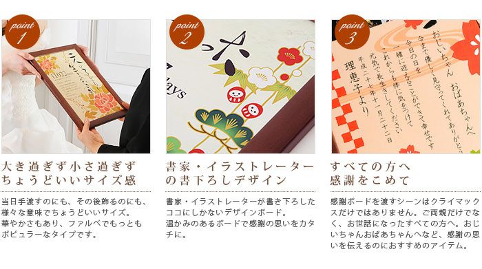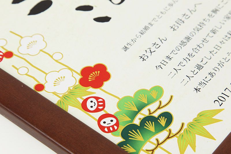 画像拡大 「両親へのプレゼント」感謝ボードデザインコレクション「松だるま」/メモリアルタイプ(日数入り) (0) 商品番号 MB-K-matsudaruma 定価 ¥ 10,450 のところ 販売価格 ¥ 6,270 税込 (1個あたりの価格です) [ 57 ポイント進呈 ] 出荷の目安 通常 出荷予定 特急対応(有料) 出荷予定 +地域別の到着目安はこちら +商品制作にデータのご提出が必要な商品ですご注文からお届けまでの流れ 送料 商品合計 ¥15,000円以上送料無料(北海道、沖縄、一部地域除く) +地域別の送料はこちら 項目を指定してカートに入れる 商品についてのお問い合わせ 宛名(必須) 選択してください お父さん お母さんへ お父さんへ お母さんへ 記載なし オリジナル(→通信欄へご記入ください) 文章タイプ(必須) 選択してください 定型文 オリジナル文(→通信欄へご記入ください) 通信欄はカートに入れた後、ご注文手続き画面の最後のページにあります。 特急オプション(必須) 選択してください 希望しない→納期10営業日(+¥0 税込) 希望する→納期5営業日(+¥2,200 税込) お名前(例 京子)(必須) ※ : / ~ などの半角記号は使用不可 挙式日(例 20XX.11.22)(必須) ※ : / ~ などの半角記号は使用不可 生年月日(例 19XX.11.22)(必須) ※ : / ~ などの半角記号は使用不可 在庫数 7 お気に入り登録 1 2 3 4 5 6 7 8 9 10+ カートに入れる 閉じる × これと似た商品を見る 結婚式両親へのプレゼント 感謝ボード(デザインコレクション)「松だるま」/メモリアルタイプ(日数入り) 結婚式でのご両親へのプレゼント。誕生から結婚までの日数をカウントしてお作りします。 メッセージの文章タイプ(定型文またはオリジナル文) 定型文 今まで大切に育ててくれてありがとう 二人で力を合わせて幸せな家庭を築きます これからも温かく見守っていてください オリジナル文 オリジナル文章(70文字以内)をご注文画面の通信欄にご記入ください※複数ご注文の場合は、文章のあとに差出人名もご記入ください 式に間に合わない!そんな方はこちら 挙式に間に合わない…そんな方もご安心ください。ご注文時に特急オプション「希望する」をお選びの上、ご注文いただくとスピード対応いたします。※別途特急オプション料金が加算されます。 スピード対応できる訳その1先にいただいている通常のご注文分よりも最優先で制作いたします。 スピード対応できる訳その2社内内製化による完全受注スタイル。また人気商品のため在庫を切らさないように在庫を豊富にそろえています。 さらにお急ぎの場合は・・・即日出荷対応のご両親プレゼントもご用意しています!→対象商品はこちらから サイズ 330×245mm 納期 10営業日(土日祝のぞく) 特急オプション「希望する」の場合は5営業日(土日祝のぞく) ※ただし、お支払いが銀行振込の場合はご入金確認後の手配となります ご注文に際して 名入れ項目(挙式日、お名前等)については、ご注文時に入力いただいたデータでお作りしますのでお間違えのないようご確認をお願いいたします 宛名、文章タイプがオリジナルご希望の場合はカートに入れたあとのご注文手続き画面の通信欄にご記入ください。(オリジナル文章の句読点はデザインによりスペース等にさせていただく場合がございます) ※挙式日以外の日付やカウント日数の印刷をご希望の場合も通信欄に具体的にご記入くださいませ例:カウント期間 誕生日から入籍日(20xx年〇月〇日) 印刷する日 結婚式の日(20xx年〇月〇日) お支払方法 名入れ商品につき「代金引換」はお選びいただけません 関連商品のご案内 ギフト用にラッピングしてお届け こちらもいかがですか? もっといろいろ比べたい! 両親プレゼントぜんぶ見る 感動サプライズ! 祖父母ギフト レビューを書く