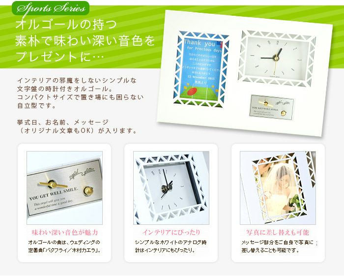 画像拡大 サンクスオルゴール(クロック)「ラグビー」/両親へのプレゼント (0) 商品番号 MB-O-crugby 販売価格 ¥ 6,380 税込 (1個あたりの価格です) [ 58 ポイント進呈 ] 出荷の目安 通常 出荷予定 特急対応(有料) 出荷予定 +地域別の到着目安はこちら +商品制作にデータのご提出が必要な商品ですご注文からお届けまでの流れ 送料 商品合計 ¥15,000円以上送料無料(北海道、沖縄、一部地域除く) +地域別の送料はこちら 項目を指定してカートに入れる 商品についてのお問い合わせ 文章タイプ(必須) 選択してください A B C D(オリジナル文章→通信欄にご記入ください) 通信欄はカートに入れた後、ご注文手続き画面の最後のページにあります。 特急オプション(必須) 選択してください 希望しない→納期7営業日(+¥0 税込) 希望する→納期4営業日(+¥2,200 税込) ラッピング(白袋花柄タグ)(必須) 選択してください 希望しない ラッピング希望する(+¥275 税込) ラッピング+紙袋(大)希望する(+¥660 税込) お名前(例 良太)(必須) ※ : / ~ などの半角記号は使用不可 挙式日(例 20XX.11.22)(必須) ※ : / ~ などの半角記号は使用不可 お気に入り登録 1 2 3 4 5 6 7 8 9 10+ カートに入れる 閉じる × これと似た商品を見る 【両親へのプレゼント】サンクスオルゴール(時計付き)ラグビー 結婚式の贈呈シーンで渡す両親プレゼントに、インテリアにもぴったりのクロック付きオルゴールはいかが?オルゴールの音色が聞く人の心を温め、挙式後も当日の思い出に浸るひとときを演出します。 メッセージの文章タイプ(定型文またはオリジナル文) A 今日まで私を大切に育ててくれて本当にありがとう 二人のような素敵な夫婦となるようにがんばります これからも見守っていてください B 今日のこのすばらしい日を迎えることができたのも二人のおかげです どうぞいつまでも健康でいてください 本当にありがとう C 皆様に感謝の気持ちを忘れずに 今後も二人で力をあわせて幸せな家庭を築きます そして、一番のありがとうを二人に… D オリジナル文章(70文字以内) ※ご注文画面の通信欄にご記入下さい(複数ご注文の場合は、文章のあとに差出人名もご記入下さい) ※オリジナル文章の句読点はデザインによりスペース等にさせていただく場合もございます やさしいメロディが織りなす しあわせのとき ねじをまいてスイッチをいれると流れてくるやさしいメロディ。曲は結婚式にぴったりの木村カエラの「バタフライ」のワンフレーズ(約15秒分)をリピート。以下ボタンよりご視聴いただけます。 申し訳ございません。ご利用のブラウザでの再生には対応していません。 その他の曲をご希望の場合はオプション(有料)で変更することもできます。「オルゴール曲変更オプション」をあわせてお申し込みください。対応可能な曲は下記オプションページからご確認くださいませ。 オルゴール曲変更オプションはこちら 式に間に合わない!そんな方はこちら 挙式に間に合わない…そんな方もご安心ください。ご注文時に特急オプション「希望する」をお選びの上、ご注文いただくとスピード対応いたします。※別途特急オプション料金が加算されます。 お届けの内容 クロック付きオルゴール(自立型) オルゴール曲:バタフライ/木村カエラ(ワンフレーズ約15秒のリピート) サイズ 180×265×60mm 材質 ABS樹脂 納期 7営業日(土日祝のぞく) 特急オプション「希望する」の場合は4営業日(土日祝のぞく) ※ただし、お支払いが銀行振込の場合はご入金確認後の手配となります ご注文に際して 挙式日、お名前(差出人)をお入れしますカート部分にご記載ください(入力された内容がそのまま印刷されます) その他 ご自身でお写真を差し替えられる場合は、115×80mmでご用意ください 関連商品のご案内 文字レイアウトを 校正できます オルゴール曲を 変更できます こちらもいかがですか? もっと比べたい! 両親プレゼントぜんぶ見る 可愛がってくれた 祖父母に贈る記念ギフト レビューを書く