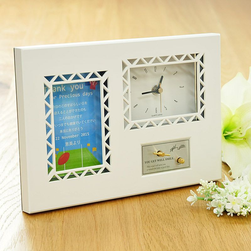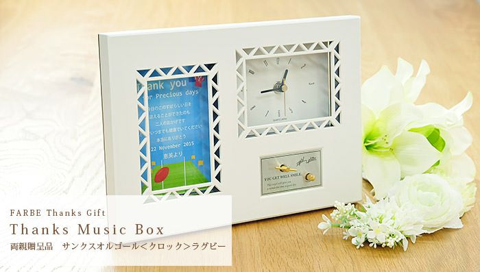 画像拡大 サンクスオルゴール(クロック)「ラグビー」/両親へのプレゼント (0) 商品番号 MB-O-crugby 販売価格 ¥ 6,380 税込 (1個あたりの価格です) [ 58 ポイント進呈 ] 出荷の目安 通常 出荷予定 特急対応(有料) 出荷予定 +地域別の到着目安はこちら +商品制作にデータのご提出が必要な商品ですご注文からお届けまでの流れ 送料 商品合計 ¥15,000円以上送料無料(北海道、沖縄、一部地域除く) +地域別の送料はこちら 項目を指定してカートに入れる 商品についてのお問い合わせ 文章タイプ(必須) 選択してください A B C D(オリジナル文章→通信欄にご記入ください) 通信欄はカートに入れた後、ご注文手続き画面の最後のページにあります。 特急オプション(必須) 選択してください 希望しない→納期7営業日(+¥0 税込) 希望する→納期4営業日(+¥2,200 税込) ラッピング(白袋花柄タグ)(必須) 選択してください 希望しない ラッピング希望する(+¥275 税込) ラッピング+紙袋(大)希望する(+¥660 税込) お名前(例 良太)(必須) ※ : / ~ などの半角記号は使用不可 挙式日(例 20XX.11.22)(必須) ※ : / ~ などの半角記号は使用不可 お気に入り登録 1 2 3 4 5 6 7 8 9 10+ カートに入れる 閉じる × これと似た商品を見る 【両親へのプレゼント】サンクスオルゴール(時計付き)ラグビー 結婚式の贈呈シーンで渡す両親プレゼントに、インテリアにもぴったりのクロック付きオルゴールはいかが?オルゴールの音色が聞く人の心を温め、挙式後も当日の思い出に浸るひとときを演出します。 メッセージの文章タイプ(定型文またはオリジナル文) A 今日まで私を大切に育ててくれて本当にありがとう 二人のような素敵な夫婦となるようにがんばります これからも見守っていてください B 今日のこのすばらしい日を迎えることができたのも二人のおかげです どうぞいつまでも健康でいてください 本当にありがとう C 皆様に感謝の気持ちを忘れずに 今後も二人で力をあわせて幸せな家庭を築きます そして、一番のありがとうを二人に… D オリジナル文章(70文字以内) ※ご注文画面の通信欄にご記入下さい(複数ご注文の場合は、文章のあとに差出人名もご記入下さい) ※オリジナル文章の句読点はデザインによりスペース等にさせていただく場合もございます やさしいメロディが織りなす しあわせのとき ねじをまいてスイッチをいれると流れてくるやさしいメロディ。曲は結婚式にぴったりの木村カエラの「バタフライ」のワンフレーズ(約15秒分)をリピート。以下ボタンよりご視聴いただけます。 申し訳ございません。ご利用のブラウザでの再生には対応していません。 その他の曲をご希望の場合はオプション(有料)で変更することもできます。「オルゴール曲変更オプション」をあわせてお申し込みください。対応可能な曲は下記オプションページからご確認くださいませ。 オルゴール曲変更オプションはこちら 式に間に合わない!そんな方はこちら 挙式に間に合わない…そんな方もご安心ください。ご注文時に特急オプション「希望する」をお選びの上、ご注文いただくとスピード対応いたします。※別途特急オプション料金が加算されます。 お届けの内容 クロック付きオルゴール(自立型) オルゴール曲:バタフライ/木村カエラ(ワンフレーズ約15秒のリピート) サイズ 180×265×60mm 材質 ABS樹脂 納期 7営業日(土日祝のぞく) 特急オプション「希望する」の場合は4営業日(土日祝のぞく) ※ただし、お支払いが銀行振込の場合はご入金確認後の手配となります ご注文に際して 挙式日、お名前(差出人)をお入れしますカート部分にご記載ください(入力された内容がそのまま印刷されます) その他 ご自身でお写真を差し替えられる場合は、115×80mmでご用意ください 関連商品のご案内 文字レイアウトを 校正できます オルゴール曲を 変更できます こちらもいかがですか? もっと比べたい! 両親プレゼントぜんぶ見る 可愛がってくれた 祖父母に贈る記念ギフト レビューを書く