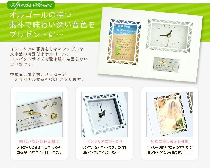 画像拡大 サンクスオルゴール(クロック)「サーフィン」/両親へのプレゼント (0) 商品番号 MB-O-csurfing 販売価格 ¥ 6,380 税込 (1個あたりの価格です) [ 58 ポイント進呈 ] 出荷の目安 通常 出荷予定 特急対応(有料) 出荷予定 +地域別の到着目安はこちら +商品制作にデータのご提出が必要な商品ですご注文からお届けまでの流れ 送料 商品合計 ¥15,000円以上送料無料(北海道、沖縄、一部地域除く) +地域別の送料はこちら 項目を指定してカートに入れる 商品についてのお問い合わせ 文章タイプ(必須) 選択してください A B C D(オリジナル文章→通信欄にご記入ください) 通信欄はカートに入れた後、ご注文手続き画面の最後のページにあります。 特急オプション(必須) 選択してください 希望しない→納期7営業日(+¥0 税込) 希望する→納期4営業日(+¥2,200 税込) ラッピング(白袋花柄タグ)(必須) 選択してください 希望しない ラッピング希望する(+¥275 税込) ラッピング+紙袋(大)希望する(+¥660 税込) お名前(例 良太)(必須) ※ : / ~ などの半角記号は使用不可 挙式日(例 20XX.11.22)(必須) ※ : / ~ などの半角記号は使用不可 お気に入り登録 1 2 3 4 5 6 7 8 9 10+ カートに入れる 閉じる × これと似た商品を見る サンクスオルゴール(時計付き)「サーフィン」/両親へのプレゼント 結婚式の贈呈シーンで渡す両親プレゼントに、インテリアにもぴったりのクロック付きオルゴールはいかが?オルゴールの音色が聞く人の心を温め、挙式後も当日の思い出に浸るひとときを演出します。 メッセージの文章タイプ(定型文またはオリジナル文) A 今日まで私を大切に育ててくれて本当にありがとう 二人のような素敵な夫婦となるようにがんばります これからも見守っていてください B 今日のこのすばらしい日を迎えることができたのも二人のおかげです どうぞいつまでも健康でいてください 本当にありがとう C 皆様に感謝の気持ちを忘れずに 今後も二人で力をあわせて幸せな家庭を築きます そして、一番のありがとうを二人に… D オリジナル文章(70文字以内) ※ご注文画面の通信欄にご記入下さい(複数ご注文の場合は、文章のあとに差出人名もご記入下さい) ※オリジナル文章の句読点はデザインによりスペース等にさせていただく場合もございます やさしいメロディが織りなす しあわせのとき ねじをまいてスイッチをいれると流れてくるやさしいメロディ。曲は結婚式にぴったりの木村カエラの「バタフライ」のワンフレーズ(約15秒分)をリピート。以下ボタンよりご視聴いただけます。 申し訳ございません。ご利用のブラウザでの再生には対応していません。 その他の曲をご希望の場合はオプション(有料)で変更することもできます。「オルゴール曲変更オプション」をあわせてお申し込みください。対応可能な曲は下記オプションページからご確認くださいませ。 オルゴール曲変更オプションはこちら 式に間に合わない!そんな方はこちら 挙式に間に合わない…そんな方もご安心ください。ご注文時に特急オプション「希望する」をお選びの上、ご注文いただくとスピード対応いたします。※別途特急オプション料金が加算されます。 お届けの内容 クロック付きオルゴール(自立型) オルゴール曲:バタフライ/木村カエラ(ワンフレーズ約15秒のリピート) サイズ 180×265×60mm 材質 ABS樹脂 納期 7営業日(土日祝のぞく) 特急オプション「希望する」の場合は4営業日(土日祝のぞく) ※ただし、お支払いが銀行振込の場合はご入金確認後の手配となります ご注文に際して 挙式日、お名前(差出人)をお入れしますカート部分にご記載ください(入力された内容がそのまま印刷されます) その他 ご自身でお写真を差し替えられる場合は、115×80mmでご用意ください 関連商品のご案内 文字レイアウトを 校正できます オルゴール曲を 変更できます こちらもいかがですか? もっと比べたい! 両親プレゼントぜんぶ見る 可愛がってくれた 祖父母に贈る記念ギフト レビューを書く