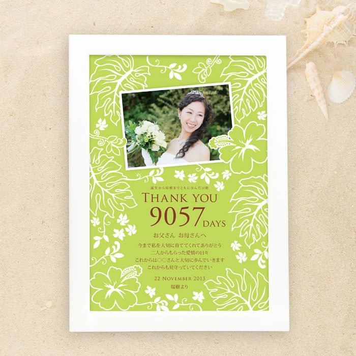 画像拡大 「親ギフト」感謝ボード アロハ・レア ライトグリーン メモリアルタイプ(日数入り) (0) 商品番号 MB-K-alohaleaG 定価 ¥ 11,000 のところ 販売価格 ¥ 7,700 税込 [ 70 ポイント進呈 ] 宛名(必須) 選択してください お父さん お母さんへ お父さんへ お母さんへ 記載なし オリジナル(→通信欄にご記入ください) 文章タイプ(必須) 選択してください 定型文 オリジナル文(→通信欄にご記入ください) 通信欄はカートに入れた後、ご注文手続き画面の最後のページにあります。 校正オプション(お客様による制作前データ確認)(必須) 選択してください 希望しない(+¥0 税込) 希望する(+¥1,650 税込) 特急オプション(必須) 選択してください 希望しない→納期10営業日(+¥0 税込) 希望する→納期5営業日(+¥2,200 税込) お名前(例 京子)(必須) ※ : / ~ などの半角記号は使用不可 挙式日(例 20XX.11.22)(必須) ※ : / ~ などの半角記号は使用不可 生年月日(例 19XX.11.22)(必須) ※ : / ~ などの半角記号は使用不可 申し訳ございません。在庫がございません。 お気に入り登録 15,000円以上のお買い物で送料無料未満の場合の送料800円~地域ごとに異なります。こちらをご覧くださいませ 商品についてのお問い合わせ 結婚式両親へのプレゼント 感謝ボード アロハ・レア ライトグリーン メモリアルタイプ(日数入り) 結婚式でのご両親へのプレゼント。お写真とメッセージ、誕生から結婚までの日数をカウントしてお作りする感動の子育て感謝状です。 (1) お写真…前撮りや家族の思い出の一枚などお好きなお写真をお入れします。 (2) カウント日数…お誕生日から挙式日をカウントした日数を刻みます。 (3) 宛名…パパ ママ、などあなただけの呼び名で自由にお入れすることも可能です。 (4) メッセージ…定型文またはオリジナル文章(70文字以内)が入ります。 (5) 挙式日…挙式日をお入れします。 (6) 差出人…差出人も愛称や連名など自由にお入れいたします。 メッセージの文章タイプ(定型文またはオリジナル文) 定型文 今まで大切に育ててくれてありがとう 二人で力を合わせて幸せな家庭を築きます これからも温かく見守っていてください オリジナル文 オリジナル文章(70文字以内)をご注文画面の通信欄にご記入ください※複数ご注文の場合は、文章のあとに差出人名もご記入ください お写真が1枚入ります お写真について【※必ずお読みください】 ※事前確認が必要な場合は、校正オプション「希望する」をお選びの上ご注文ください。(別途オプション料金が加算されます。) ご注文後のながれ まずはショッピングカートよりご注文を完了してください。その後、専用フォームよりお写真のご提出をお願いいたします。 ご注文後なるべく早めにお写真をお送りください。お写真のレイアウトにご希望がある場合はこのフォームにお書き添えください。 スマホでOK!お写真アップロードフォーム 式に間に合わない!そんな方はこちら 挙式に間に合わない…そんな方もご安心ください。ご注文時に特急オプション「希望する」をお選びの上、ご注文いただくとスピード対応いたします。※別途特急オプション料金が加算されます。 サイズ 335×250×45mm 納期 お写真到着から10営業日(土日祝のぞく) 特急オプション「希望する」の場合は5営業日(土日祝のぞく) ※ただし、お支払いが銀行振込の場合はご入金確認後の手配となります ご注文に際して 名入れ項目(挙式日、お名前等)については、ご注文時に入力いただいたデータでお作りしますのでお間違えのないようご確認をお願いいたします 宛名、文章タイプがオリジナルご希望の場合はカートに入れたあとのご注文手続き画面の通信欄にご記入ください。(オリジナル文章の句読点はデザインによりスペース等にさせていただく場合がございます) ※挙式日以外の日付やカウント日数の印刷をご希望の場合も通信欄に具体的にご記入くださいませ例:カウント期間 誕生日から入籍日(20xx年〇月〇日) 印刷する日 結婚式の日(20xx年〇月〇日) フラワーアレンジについて アートフラワーは輸入品のため写真とは若干異なる可能性がございますので予めご了承ください お支払方法 名入れ商品につき「代金引換」はお選びいただけません 関連商品のご案内 ギフト用にラッピングしてお届け こちらもいかがですか? もっといろいろ比べたい! 両親プレゼントぜんぶ見る 感動サプライズ! 祖父母ギフト レビューを書く