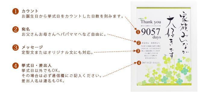 他の画像を見る ダブルフォトフレーム「クローバー」/両親へのプレゼント (0) 販売価格 ¥ 14,300 税込 商品について 閉じる 贈呈シーンがぐっと引きたつ大きめサイズのダブルフォトフレーム子育て感謝状。自分で好きな写真をセットして贈れます。カスタマイズ可能なメッセージやカウント日数入り。作家によるあたたかみのある筆文字は6種類の文章から選択可能。幸せを呼ぶ四つ葉のクローバーのデザインです。 在庫切れ 詳細を見る お気に入り登録