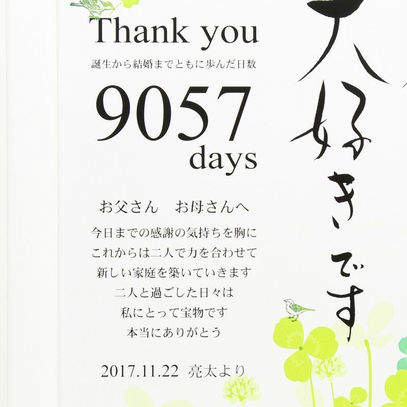他の画像を見る ダブルフォトフレーム「フラワー」/両親へのプレゼント (0) 販売価格 ¥ 14,300 税込 商品について 閉じる 贈呈シーンがぐっと引きたつ大きめサイズのダブルフォトフレーム子育て感謝状。自分で好きな写真をセットして贈れます。カスタマイズ可能なメッセージやカウント日数入り。作家によるあたたかみのある筆文字は6種類の文章から選択可能。水彩風のやさしいデザインです。 在庫切れ 詳細を見る お気に入り登録