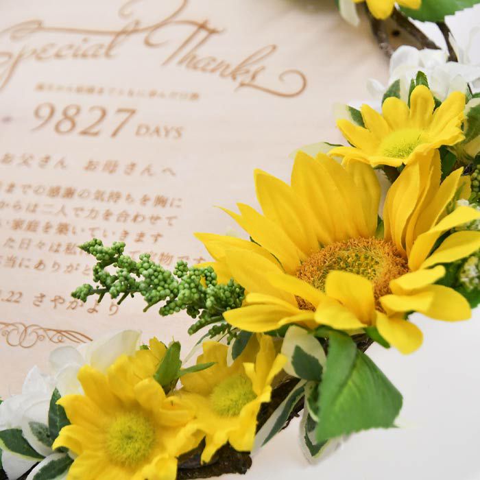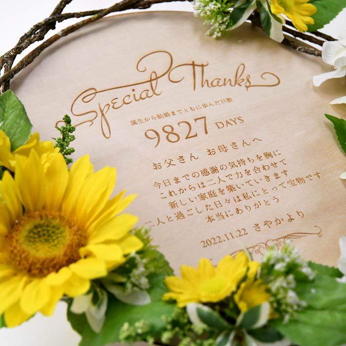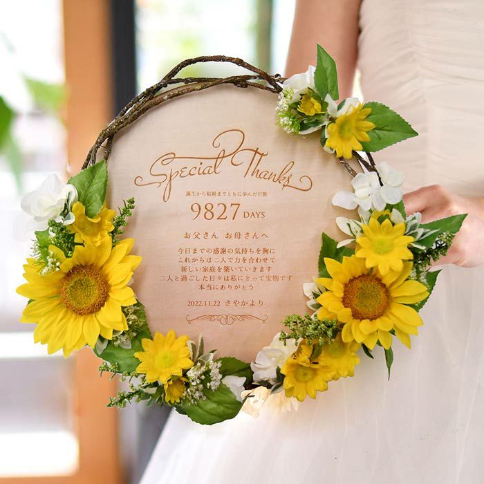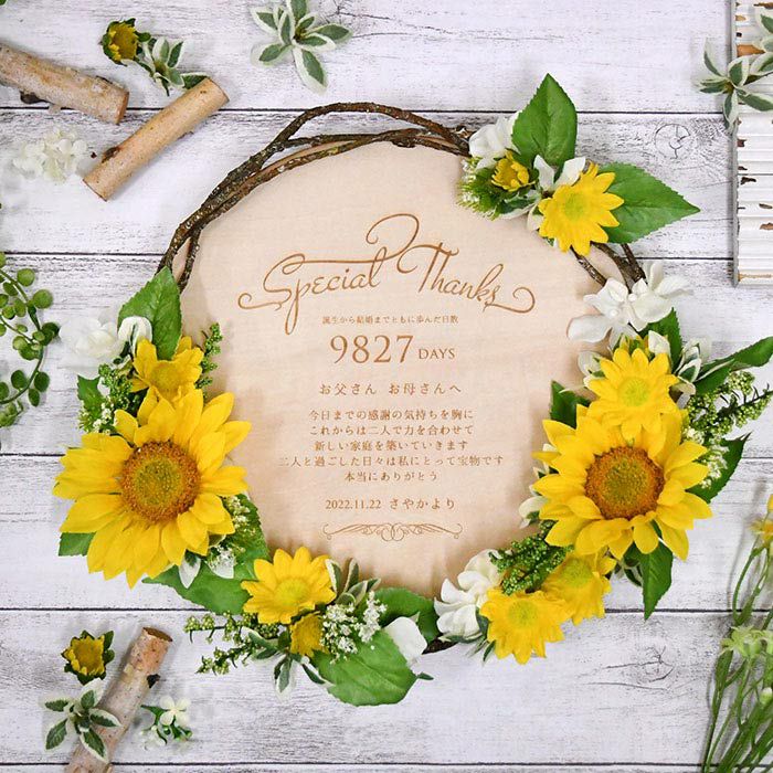 他の画像を見る 数量限定 限定!ひまわりアレンジ 子育て感謝状×木製レーザー刻印 限定「ひまわり」 (0) 販売価格 ¥ 13,200 税込 商品について 閉じる ひまわりの花をアレンジした木製ボードにレーザー刻印されたリース型の子育て感謝状。美しいアーティフィシャルフラワーが華やかさを演出し、感謝のメッセージはカスタマイズ可能。木製ボードは年月がたつほどに味わいが増して、ずっと消えない感謝の気持ちを残すことができます。 詳細を見る お気に入り登録
