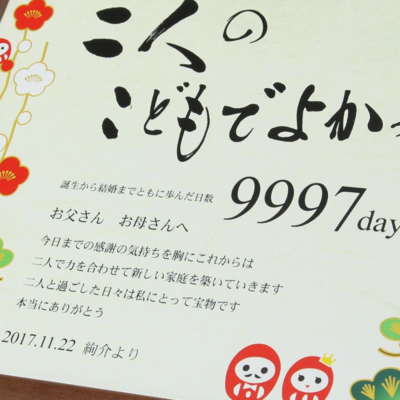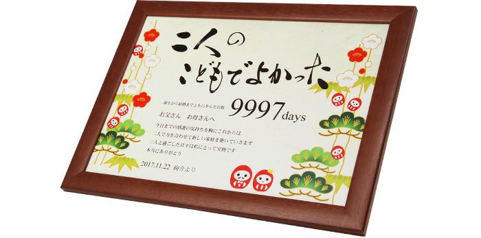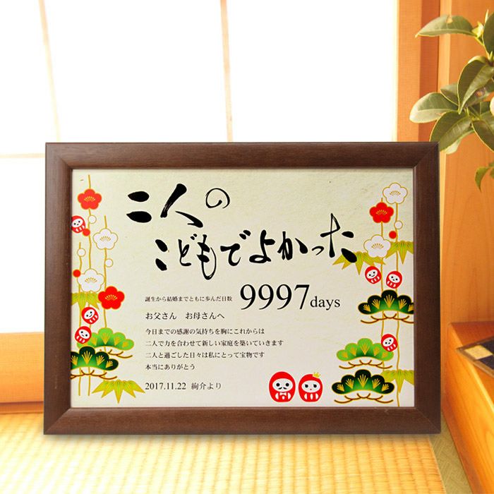 他の画像を見る 「両親へのプレゼント」感謝ボードデザインコレクション「松だるま」/メモリアルタイプ(日数入り) (0) 定価 ¥ 10,450 のところ 販売価格 ¥ 6,270 税込 商品について 閉じる 書家・イラストレータが書き下ろしたここにしかないデザインボード。カスタマイズ可能なメッセージやカウント日数入りの子育て感謝状です。大きすぎず小さすぎず渡すにも飾るにもちょうどいいサイズ感。フレーム入りでインテリアとしてずっと飾れます。 詳細を見る お気に入り登録