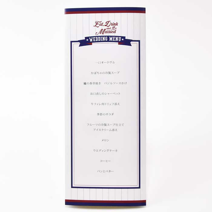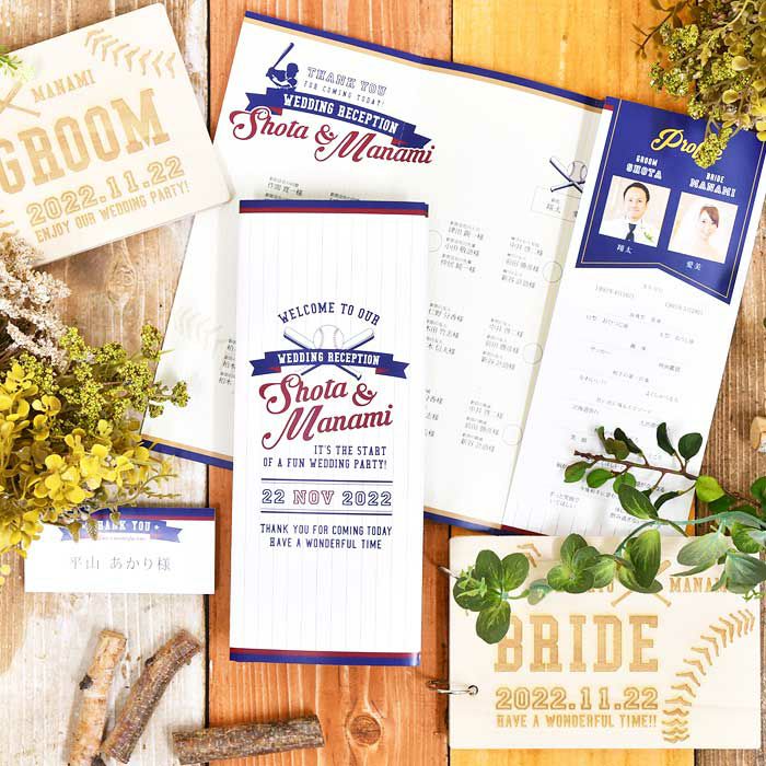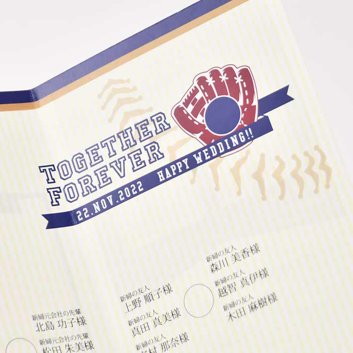 野球をテーマにスタイリッシュにデザインした席次表。入力から印刷まですべておまかせ、お写真入りのプロフィールやメニュー表など”ほしい”が全部入りで大満足の席次表です。