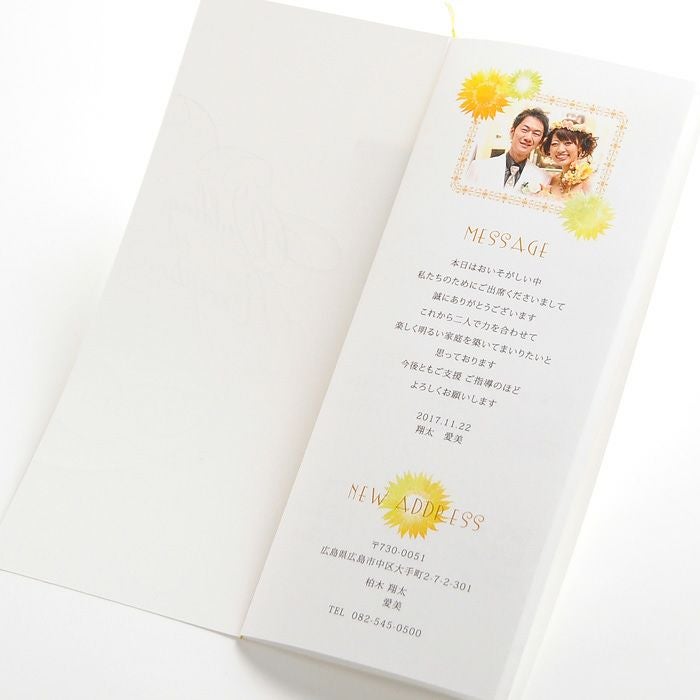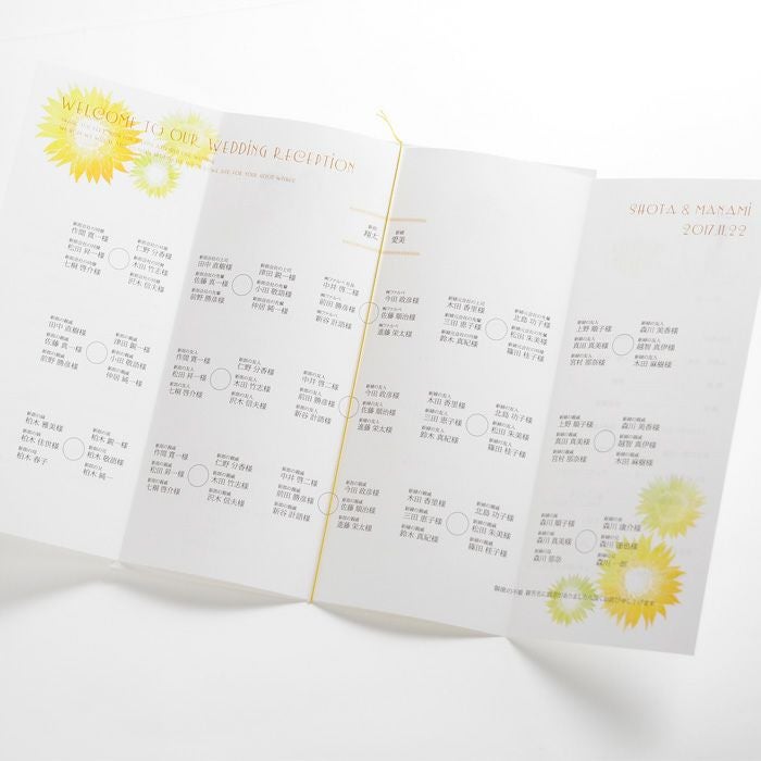 他の画像を見る 入力印刷付き \席次表完成品オーダー「ロッティサマー」(印刷つき) (0) 定価 ¥ 880 のところ 販売価格 ¥ 748 税込 商品について 閉じる 上品な輝きをはなつパール台紙にゴールドのグラフィカルな英字を大胆に飾った華やかなデザイン。中面には水彩風のひまわりの花をあしらって季節感いっぱいに。夏の結婚式にぴったりな席次表です。 在庫切れ 詳細を見る お気に入り登録
