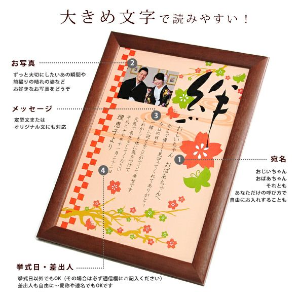 結婚式に出席できないおじいちゃんおばあちゃんには結婚の報告と感謝を伝えるために。出席してもらえる場合は、感動のサプライズ演出に。結婚式はしない、というお二人もフォトウェディングのお写真を特別な感謝状に仕立てて。