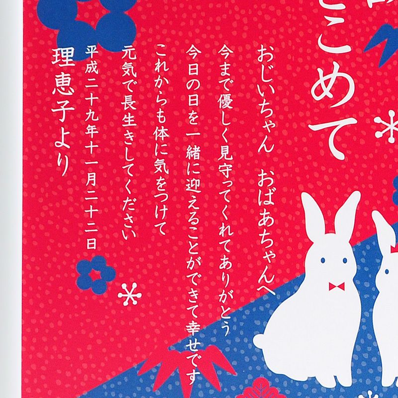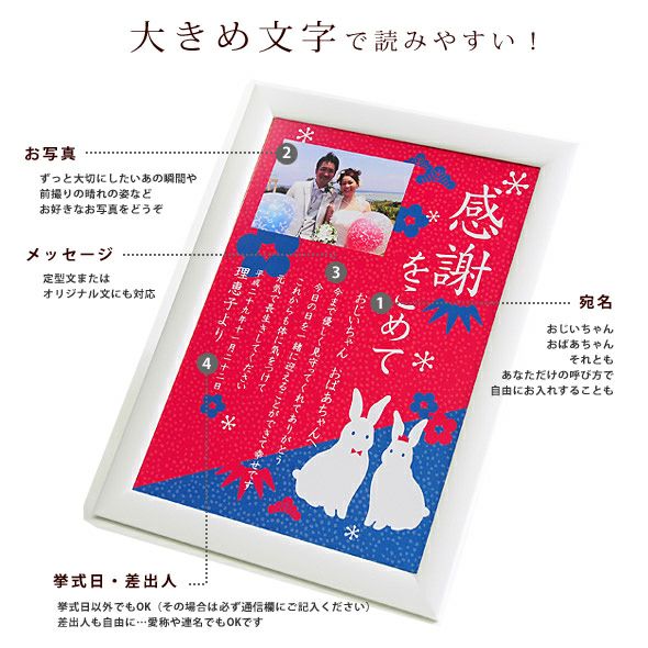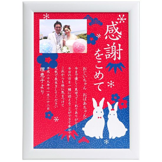 画像拡大 \孫からの贈りもの/ 祖父母へ贈る感謝状「洋兎」結婚式/長寿祝い (0) 商品番号 MB-SG3 定価 ¥ 11,000 のところ 販売価格 ¥ 7,700 税込 [ 70 ポイント進呈 ] 宛名(必須) 選択してください おじいちゃん おばあちゃんへ おじいちゃんへ おばあちゃんへ 記載なし その他(→通信欄にご記入くださいませ) 文章タイプ(必須) 選択してください 定型文 オリジナル(→通信欄にご記入くださいませ) 通信欄はカートに入れた後、ご注文手続き画面の最後のページにあります。 特急オプション(必須) 選択してください 希望しない→納期10営業日(+¥0 税込) 希望する→納期5営業日(+¥2,200 税込) 校正オプション(お客様による制作前データ確認)(必須) 選択してください 希望しない(+¥0 税込) 希望する(+¥1,650 税込) ラッピングオプション(必須) 選択してください 希望しない 希望する(+¥330 税込) お名前(例 良太)(必須) ※ : / ~ などの半角記号は使用不可 挙式日(例 20XX.11.22)(必須) ※ : / ~ などの半角記号は使用不可 申し訳ございません。在庫がございません。 お気に入り登録 15,000円以上のお買い物で送料無料未満の場合の送料800円~地域ごとに異なります。こちらをご覧くださいませ 商品についてのお問い合わせ おじいちゃん おばあちゃんへ贈る感謝ボード「洋兎」/祖父母へのプレゼント かわいがってくれたおじいちゃんおばあちゃんへ結婚式という特別な日にプレゼントを贈りませんか?ご両親同様に大事な人だから、感謝の気持ちを形にして記念に残る贈り物を。式後にお部屋に飾ってもらえば、いつまでも感謝の想いが残る特別なプレゼントに。 (1) 宛名…おじいちゃん おばあちゃん その他もあなただけの呼び名で自由にお入れすることも可能です (2) お写真…お写真1枚をご用意ください 大切な思い出の写真や前撮りのお写真等お好きなお写真をどうぞ (3) メッセージ…定型文またはオリジナル文章(70文字以内) (4) 挙式日・差出人…差出人も愛称や連名など自由にお入れいたします メッセージの文章タイプ(定型文またはオリジナル文) 定型文 今まで優しく見守ってくれてありがとう 今日の日を一緒に迎えることができて幸せです これからも体に気をつけて元気で長生きしてください オリジナル オリジナル文(70文字以内) ※ご注文画面の通信欄にご記入下さい(複数ご注文の場合は、文章のあとに差出人名もご記入下さい) ※オリジナル文章の句読点はデザインによりスペース等にさせていただく場合もございます お写真が1枚入ります お写真について【※必ずお読みください】 ご注文後のながれ まずはショッピングカートよりご注文を完了してください。その後、専用フォームよりお写真のご提出をお願いいたします。 ご注文後なるべく早めにお写真をお送りください。お写真のレイアウトにご希望がある場合はこのフォームにお書き添えください。 スマホでOK!お写真アップロードフォーム 式に間に合わない!そんな方はこちら 挙式に間に合わない…そんな方もご安心ください。ご注文時に特急オプション「希望する」をお選びの上、ご注文いただくとスピード対応いたします。※別途特急オプション料金が加算されます。 祖父母ギフトを贈るべき理由とは? お届けの内容 祖父母用感謝ボード サイズ 330×245mm 納期 お写真到着から10営業日(土日祝のぞく) 特急オプション「希望する」の場合は5営業日(土日祝のぞく) ※ただし、お支払いが銀行振込の場合はご入金確認後の手配となります ご注文に際して 挙式日、お名前(差出人)をお入れしますカート部分にご記載ください(入力された内容がそのまま印刷されます) お支払方法 名入れ商品につき「代金引換」はお選びいただけません こちらもいかがですか? 祖父母ギフト ぜんぶ見る ご両親への プレゼントはこちら レビューを書く