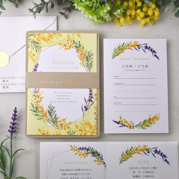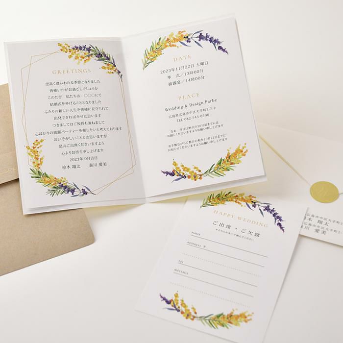 画像拡大 入力印刷付き 「ミモザ・ルフレ」結婚式招待状5部~(入力・印刷込) 4.00 (1) 商品番号 OD-i-reflet 販売価格 ¥ 9,900 税込 〜 販売価格 ¥ 税込 [ 90 ポイント進呈 ] 〜 [ ポイント進呈 ] 出荷の目安 ご注文後すぐ素材を提出いただいた場合 通常 出荷予定 特急対応(有料) 出荷予定 +地域別の到着目安はこちら +商品制作にデータのご提出が必要な商品ですご注文からお届けまでの流れ 送料 商品合計 ¥15,000円以上送料無料(北海道、沖縄、一部地域除く) +地域別の送料はこちら 項目を指定してカートに入れる 商品についてのお問い合わせ あわせて注文できるオプション 予備用の封筒を追加 個別に案内付箋セット ※事前確認・校正は【LINE】でも対応可能です。《校正専用LINE友だち登録》はこちらから。 ご購入後1営業日以内に届く承りメールでもご案内します。 本状と台紙のお届けの状態(必須) 本状と台紙のセットをする/しないをお選びください 選択してください セット希望しない セット希望する(+¥2,200 税込) 宛名印刷(筆耕)(必須) 選択してください 希望しない(+¥0 税込) 希望する(~10部まで)(+¥1,650 税込) 希望する(11部~20部まで)(+¥3,300 税込) 希望する(21部~30部まで)(+¥5,500 税込) 希望する(31部~40部まで)(+¥7,700 税込) 希望する(41部~50部まで)(+¥9,900 税込) 希望する(51部~60部まで)(+¥12,100 税込) 希望する(61部~70部まで)(+¥14,300 税込) 希望する(71部~80部まで)(+¥16,500 税込) 納期特急オプション(必須) 選択してください 希望しない→納期10営業日(+¥0 税込) 希望する→納期5営業日(+¥3,300 税込) 招待状部数 5部 ¥ 9,900 税込 10部 ¥ 9,900 税込 20部 ¥ 11,000 税込 30部(1部@400円) ¥ 13,200 税込 40部(1部@400円) ¥ 17,600 税込 50部(1部@400円) ¥ 22,000 税込 60部(1部@400円) ¥ 26,400 税込 70部(1部@400円) ¥ 30,800 税込 80部(1部@400円) ¥ 35,200 税込 お気に入り登録 1 2 3 4 5 6 7 8 9 10+ カートに入れる 閉じる × これと似た商品を見る 結婚式招待状「ミモザ・ルフレ」完成品オーダー(入力印刷込) 同じデザインの席次表を見る 同じデザインの席札を見る 愛と幸福を呼ぶとされているミモザと、献身的な愛が花言葉のラベンダーのデザインが結婚式にぴったり!パソコンやプリンターを持っていない方も安心なファルベの完成品オーダー招待状です。 オーダーならではの安心感!すべてプロにお任せ この招待状なら入力・印刷・組み立てまで全部おまかせ♡安心とハイクオリティが叶う完成品オーダーです。 ナチュラルウェディングをランクアップ! あたたかみのあるクラフト紙を組み合わせるというひと工夫でナチュラル感と特別感がUP。さらにゴールドの箔押しの文字で上品な高級感もプラス♡ナチュラルウェディングを一層おしゃれに演出できます。 表紙にはおしゃれな英文入り。おしゃれなだけじゃなく、ちゃんと結婚式の招待状にふさわしい意味のある英文があしらわれています。 カートに入れるボタンにジャンプする すみずみまでこだわりたっぷり♡絶品招待状 招待状本状にはデザインカバーを重ねてクラフト紙にセット。同じクラフト紙で帯締めするという凝ったデザイン。表紙が可愛いのはもちろんですが、開いた中もとってもおしゃれ!さらに返信はがきもお揃いのデザインと、すみずみまでこだわりがつまった招待状です。 カートに入れるボタンにジャンプする ご注文からお届けまで まずはショッピングカートよりご注文を完了してください。その後、専用フォームより原稿のご提出をお願いいたします。 原稿アップロードフォームはこちら そこが知!オーダりたいー招待状よくある質問 こんな時どうすればいいの?こんなコトできる?オーダー招待状のよくある質問はこちらから。気になるギモンをご注文前に解決! よくある質問を見る お届けの内容 (1)招待状本状 (2)返信はがき(宛名印刷込) (3)封筒(差出人印刷込)※封筒に宛名印刷および切手は含まれません (4)封シール サイズ クラフト台紙:115×167mm 返信はがき:100×148mm 封筒:洋1サイズ/120×176mm 納期 原稿到着から10営業日(土日祝のぞく) ※ただし、お支払いが銀行振込の場合はご入金確認後の手配となります。 ※お急ぎの方は、特急オプションをあわせてご注文ください ご注文に際して ご注文は5部より承ります。 レイアウトはお任せいただきます(校正にてご確認頂けます) お支払い 名入れ商品につき「代金引換」はお選びいただけません。 ご注文後の流れ ご注文完了後、お早めに専用フォームより原稿をご送付ください。 ご注文→原稿送付→校正→印刷→商品発送 招待状原稿送付フォーム 封筒宛名印刷(筆耕)オーダーシートDL 一緒に注文できるオプション 中国語、韓国語英語、フランス語表記も 付箋セット親族紹介、挙式時間案内の付箋も 封筒追加オプション 予備用の封筒を追加 同じシリーズ・関連商品のご案内 席次表もお揃いでおしゃれにコーデ DIY派はこちら招待状手作りキット こちらもいかがですか? もっといろいろ比べたい!招待状ぜんぶ見る 早めの準備がオススメ両親プレゼント カートに入れるボタンにジ