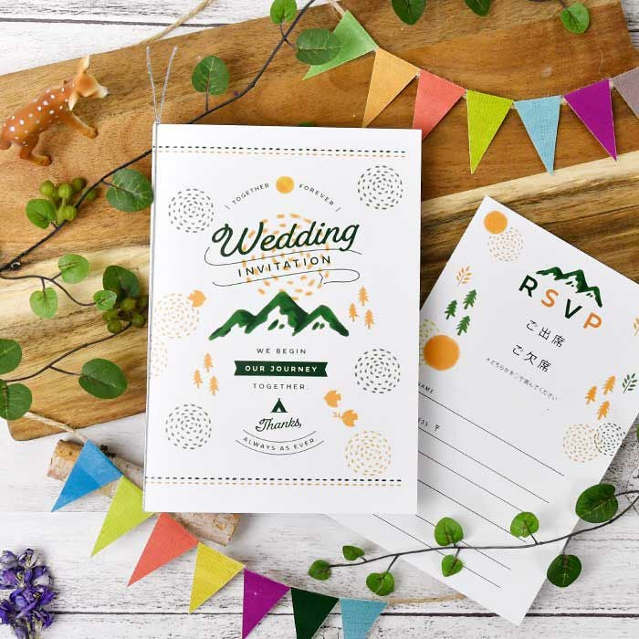 画像拡大 入力印刷付き 「アウトドア」結婚式招待状10部~(入力・印刷込) (0) 商品番号 od-i-outdoor 販売価格 ¥ 9,900 税込 〜 販売価格 ¥ 税込 [ 90 ポイント進呈 ] 〜 [ ポイント進呈 ] 出荷の目安 ご注文後すぐ素材を提出いただいた場合 通常 出荷予定 特急対応(有料) 出荷予定 +地域別の到着目安はこちら +商品制作にデータのご提出が必要な商品ですご注文からお届けまでの流れ 送料 商品合計 ¥15,000円以上送料無料(北海道、沖縄、一部地域除く) +地域別の送料はこちら 項目を指定してカートに入れる 商品についてのお問い合わせ あわせて注文できるオプション 予備用の封筒を追加 個別に案内付箋セット ※事前確認・校正は【LINE】でも対応可能です。《校正専用LINE友だち登録》はこちらから。 ご購入後1営業日以内に届く承りメールでもご案内します。 宛名印刷(筆耕)(必須) 選択してください 希望しない(+¥0 税込) 希望する(~10部まで)(+¥1,650 税込) 希望する(11部~20部まで)(+¥3,300 税込) 希望する(21部~30部まで)(+¥5,500 税込) 希望する(31部~40部まで)(+¥7,700 税込) 希望する(41部~50部まで)(+¥9,900 税込) 希望する(51部~60部まで)(+¥12,100 税込) 希望する(61部~70部まで)(+¥14,300 税込) 希望する(71部~80部まで)(+¥16,500 税込) 本状と台紙のお届けの状態(必須) 本状と台紙のセットをする/しないをお選びください 選択してください セット希望しない(+¥0 税込) セット希望する(+¥2,200 税込) 納期特急オプション(必須) 選択してください 希望しない→納期10営業日(+¥0 税込) 希望する→納期5営業日(+¥3,300 税込) 招待状部数 10部 ¥ 9,900 税込 20部 ¥ 9,900 税込 30部(1部@385円) ¥ 11,550 税込 40部(1部@385円) ¥ 15,400 税込 50部(1部@385円) ¥ 19,250 税込 60部(1部@385円) ¥ 23,100 税込 70部(1部@385円) ¥ 26,950 税込 80部(1部@385円) ¥ 30,800 税込 お気に入り登録 1 2 3 4 5 6 7 8 9 10+ カートに入れる 閉じる × これと似た商品を見る 「アウトドア」招待状(入力印刷込)/結婚式招待状 同じデザインの席次表を見る 同じデザインの席札を見る キャンプやグランピング、山登りにトレッキング!アウトドア好きなおふたりのためのおしゃれなデザイン。入力から印刷、組み立てまで全部おまかせがうれしい完成品オーダーの招待状です。 おしゃれで可愛い! ナチュラルウェディングに グリーンとオレンジを基調にして、山や木、鳥にテントなどアウトドアにぴったりなモチーフをおしゃれにデザイン。ガーデンウェディングや自然をテーマにした結婚式にもおススメな招待状です。 新しい旅を共に! すみずみまでこだわりのデザイン 表紙には「WE BEGIN OUR JOURNEY TOGETHER」の英文が添えられています。”私たちの新たな門出です”という意味。おふたりの「JOURNEY=旅」のはじまりをお知らせするのにぴったりのHAPPYなデザイン! 表紙を開くと中面にもおしゃれなデザインがちりばめられています。すみずみにまでこだわりがつまった招待状です。 オーダーならではの安心感 すべてプロにお任せ! この招待状なら入力・印刷・筋入れ・組み立てまで全部おまかせ。届いたらすぐに投函準備ができるから忙しい花嫁さんも安心です。 本状だけでなく返信はがきもトータルでおしゃれなデザイン。返信はがきの宛名や封筒の差出人も印刷込。さらに封シールも付く充実の内容で、結婚準備もスムーズに。 ご注文からお届けまで まずはショッピングカートよりご注文を完了してください。その後、専用フォームより原稿のご提出をお願いいたします。 原稿アップロードフォームはこちら おすすめ! 当日アイテムもトータルコーデ おそろいデザインの席次表と席札もシリーズでご用意しています。招待状と当日のペーパーアイテムもトータルでコーディネートして、テーマのあるおしゃれな結婚式に♡ アウトドア席次表はこちらから そこが知りたい!オーダー招待状よくある質問 こんな時どうすればいいの?こんなコトできる?オーダー招待状のよくある質問はこちらから。気になるギモンをご注文前に解決! よくある質問を見る お届けの内容 (1)招待状本状 (2)返信はがき(宛名印刷込) (3)封筒(差出人印刷込)※封筒に宛名印刷および切手は含まれません (4)封シール サイズ 本状:218×150mm 返信はがき:100×148mm 封筒:洋1サイズ/120×176mm 納期 原稿到着から10営業日(土日祝のぞく) ※ただし、お支払いが銀行振込の場合はご入金確認後の手配となります。 ※お急ぎの方は、特急オプションをあわせてご注文ください ご注文に際して ご注文は10部より承ります。 レイアウトはお任せいただきます(校正にてご確認頂けます) お支払い 名入れ商品につき「代金引換」はお選びいただけません。 ご注文後の流れ ご注文完了後、お早めに専用フォームより原稿をご送付ください。 ご注文→原稿送付→校正→印刷→商品発送 招待状原稿送付フォーム 封筒宛名印刷(筆耕)オーダーシートDL 一緒に注文できるオプション 中国語、韓国語英語、フランス語表記も 付箋セット親族紹介、挙式時間案内も 封筒追加オプション 予備用の封筒を追加 シリーズ商品