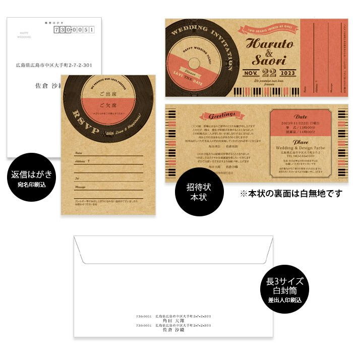 まず目に飛び込んでくるのはレコードのデザイン。よく見るとあちこちに鍵盤があしらわれていたり、こだわりが満載。音楽好きの二人らしさが詰まった招待状です。返信はがきまで可愛くてゲストも思わず笑顔になりそう♪