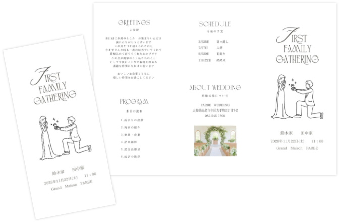 顔合わせしおり購入派向けに、プロフィールや家族紹介、当日の内容をきれいにまとめて印刷した状態でお届けします。手作り派には、LINE登録でもらえる冊子タイプ・三つ折りタイプの無料テンプレートをご用意しています。