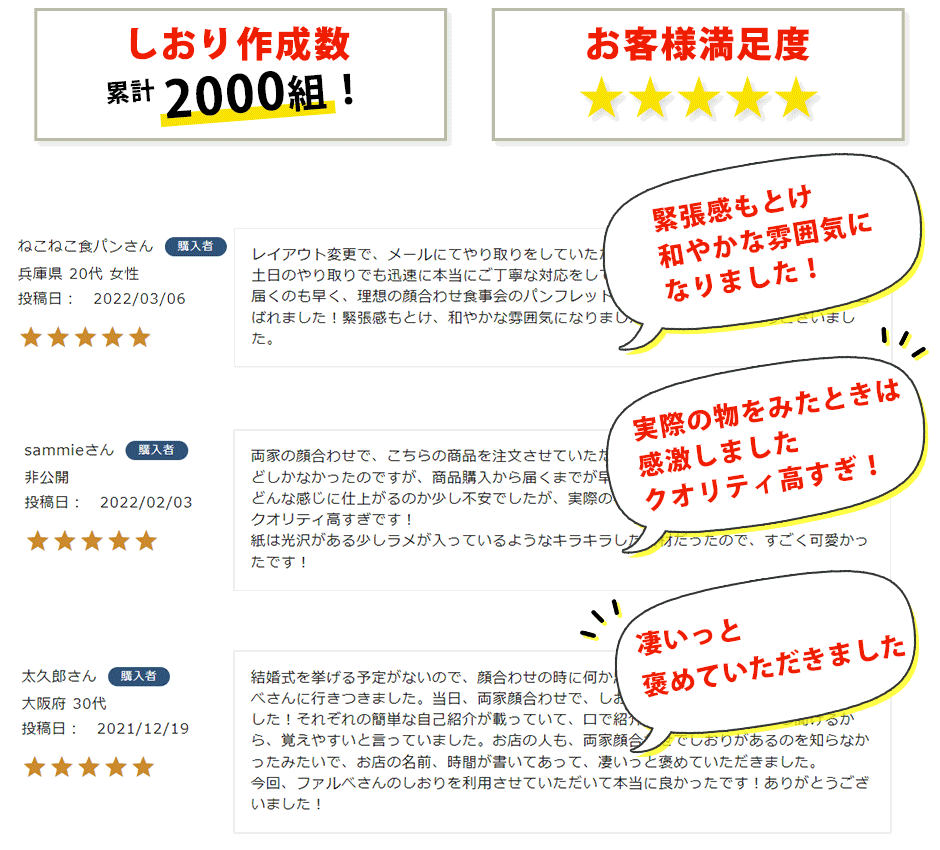 ファルベは業界でいち早く顔合わせ会しおりの手作りキットを発売して、これまで提供した無料テンプレートのダウンロード数は10万回以上。多くのしおり制作に携わってきた専門家です。そんな経験豊富なファルベだからこそわかるノウハウがぎゅっとつめこまれた顔合わせしおりは満足度も星5つ!