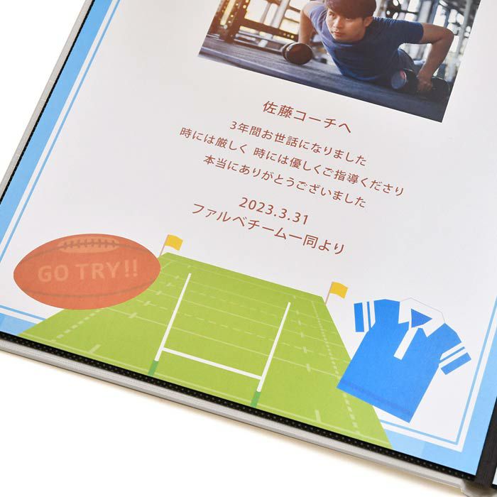 右面はフリースペースなので自由にコメントを書いていただくことができます。ラグビーチームからのギフトや、ラグビー好きの方にもぴったりな特別感のある記念品です。