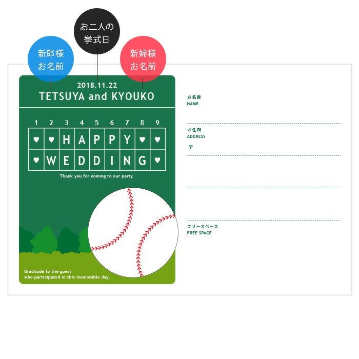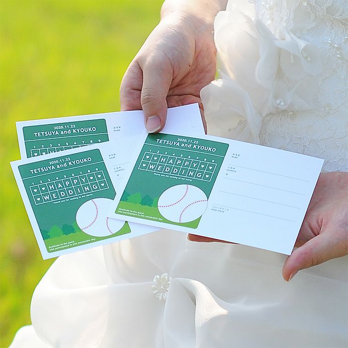 画像拡大 挙式日名前入りゲストカード!「野球」芳名カード(ハガキサイズ10枚入り)芳名帳ゲストブック 5.00 (1) 商品番号 GB-C-baseball 定価 ¥ 880 のところ 販売価格 ¥ 528 税込 [ 5 ポイント進呈 ] ご注文は30枚より承ります 新郎様のお名前(例 Tetsuya)(必須) ※ : / ~ などの半角記号は使用不可 新婦様のお名前(例 Kyoko)(必須) ※ : / ~ などの半角記号は使用不可 挙式日(例 20XX.11.22)(必須) ※ : / ~ などの半角記号は使用不可 お気に入り登録 1 2 3 4 5 6 7 8 9 10+ カートに入れる 15,000円以上のお買い物で送料無料未満の場合の送料800円~地域ごとに異なります。こちらをご覧くださいませ 商品についてのお問い合わせ 野球芳名カード(はがきサイズカード10枚入) お二人のお名前と挙式日が入る、はがきサイズの芳名カードができました。 ハガキ用のファイルにこの芳名カードを入れれば、オリジナルの芳名帳になります。 サイズ ハガキサイズ/148×100mm お届けの内容 芳名カード…10枚(新郎新婦のローマ字名+挙式日入り) 注意点 印刷方法の関係上、印刷位置が多少ずれる場合がございます。 予めご了承ください。 ご注文に際して 挙式日、お名前については、カート部分にご記入ください。 納期 通常1~2営業日以内に発送予定(土日祝除く)※ただし、振込の場合は入金確認後の発送となります お支払い方法 名入れ商品につき「代金引換」はお選びいただけません 5.00 1 MIKI 2 購入者 非公開 投稿日 2022/09/03 野球好きにはたまらないデザインでした! とってもかわいくて、わたしたちの結婚式のテーマに合っていました。 注文から対応もとても早く、すぐに届きました! すべてのレビューを見る レビューを書く