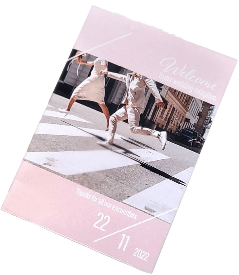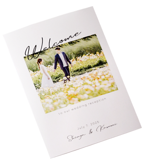 両面カラー印刷し折りまでおこないお届けするタイプです。4ページといった複数枚を綴じる必要のない場合や見開き部分のお写真やお名前が金具にかかることを懸念される方にオススメの仕様です。(ゴムは別途オプションです)