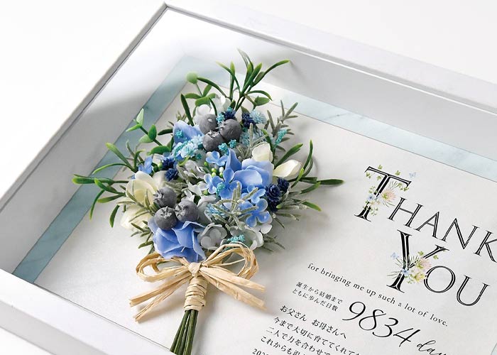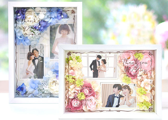 BOXフレームタイプのアイテムなら、お花の部分に埃なども入らないので、保管しやすく飾りやすいと花嫁さんたちから人気です。