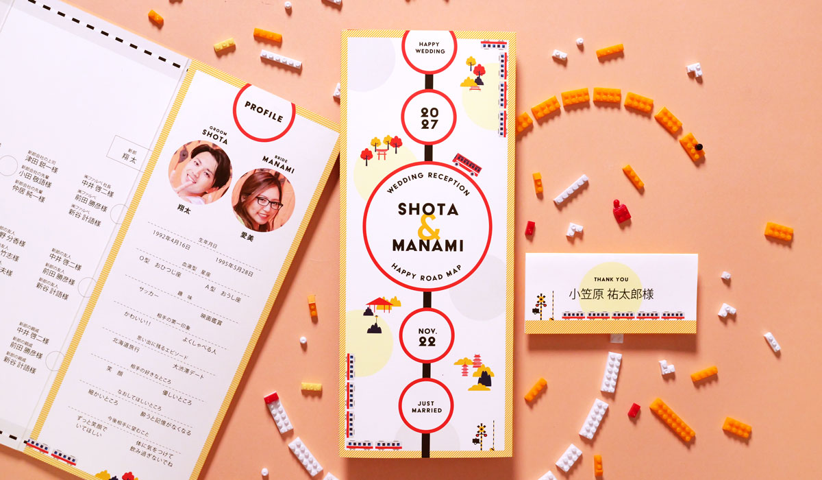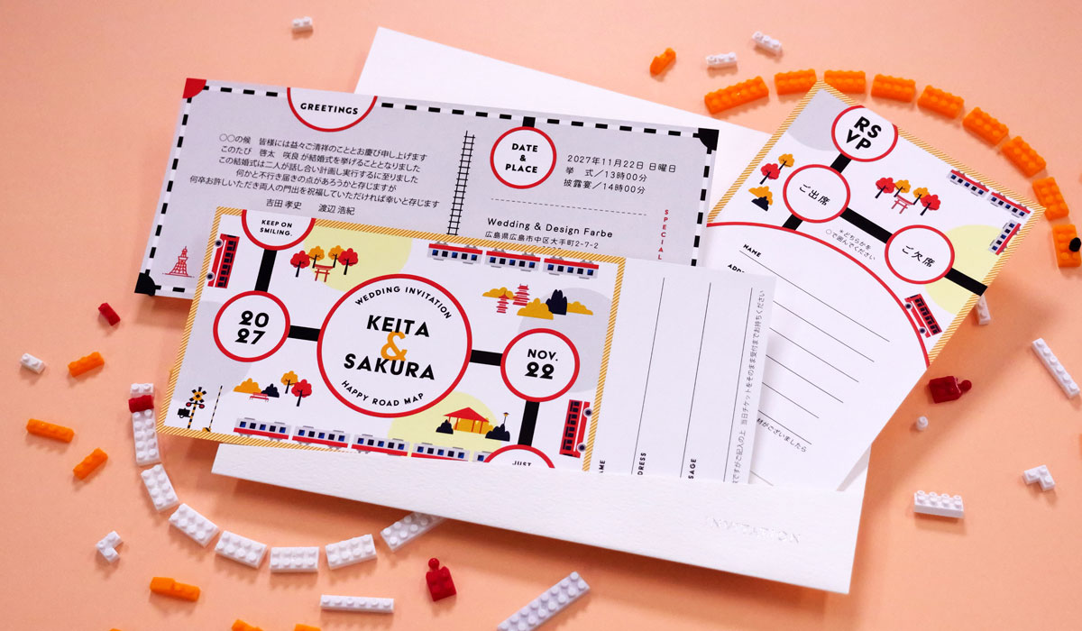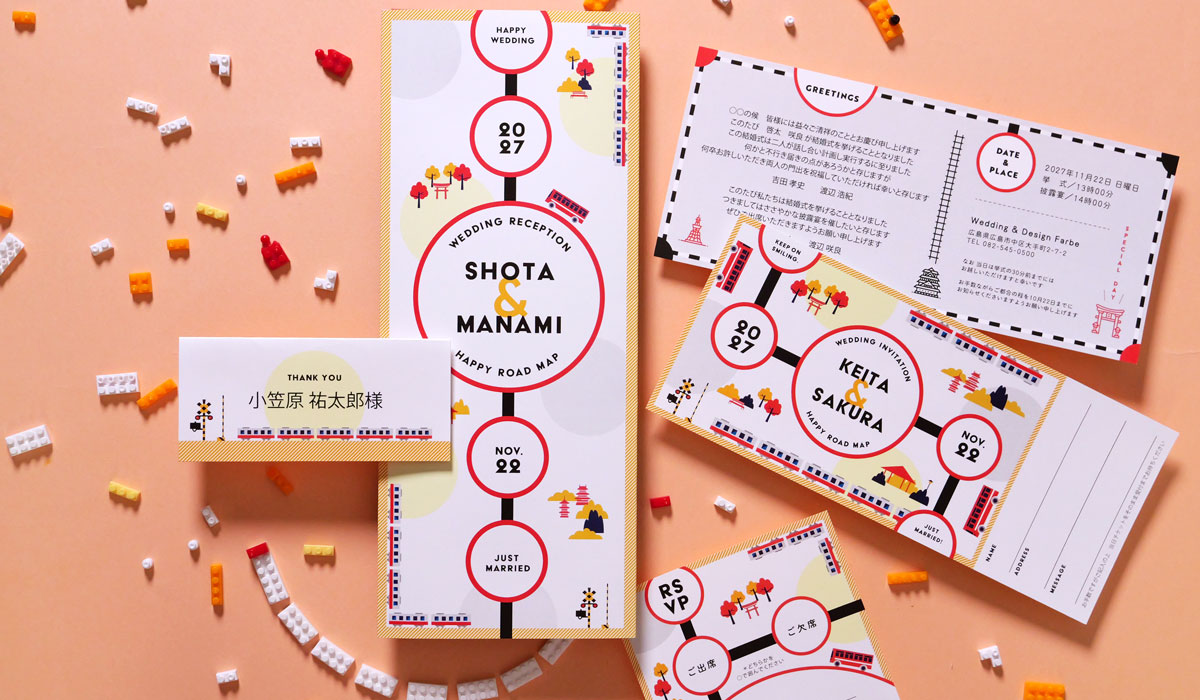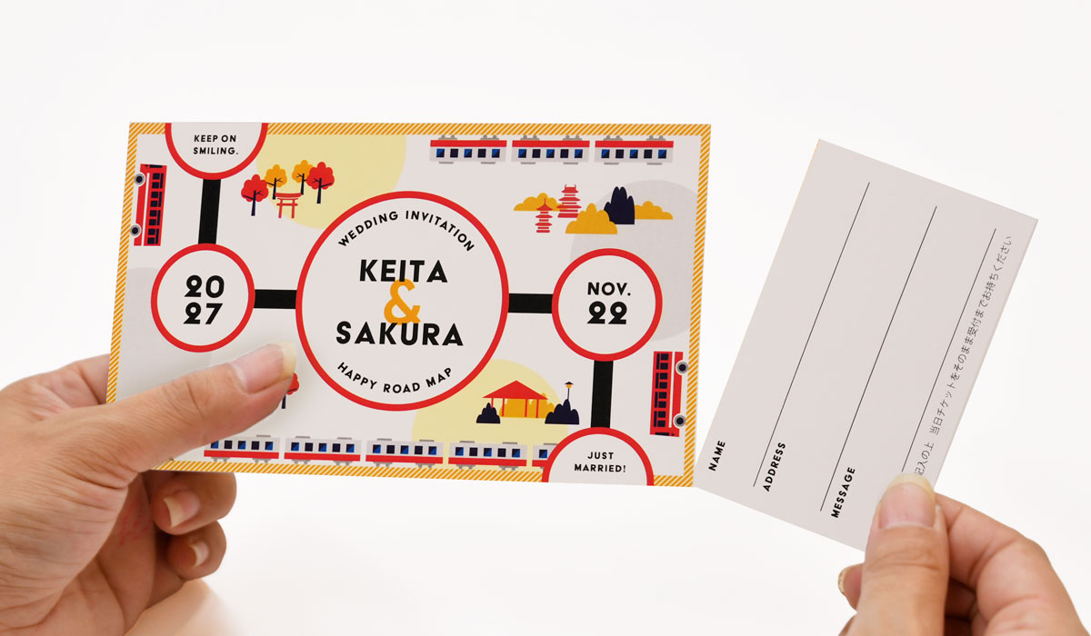 路線図をモチーフにした可愛らしい配色のポップなデザインシリーズ。二人の新しい道をどこまでも進み続けてほしいと思いを込めて、あえてゴールを描かないデザインにしています。電車好きな人だけでなく、遠距離恋愛を実らせたカップルにもおすすめ!