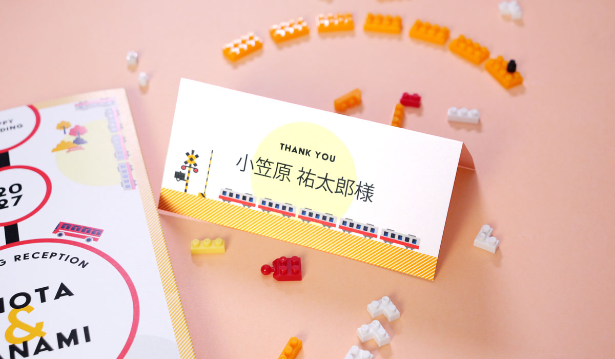 電車の形に型抜きをほどこした可愛いトロッコ電車風席札。珍しい形の席札は特別感たっぷりでテーブルについたゲストも思わずニッコリ笑顔になりそう。少ない部数でもご注文が可能なので、結婚式に来てくれたお子様への席札にする方もいらっしゃいます。