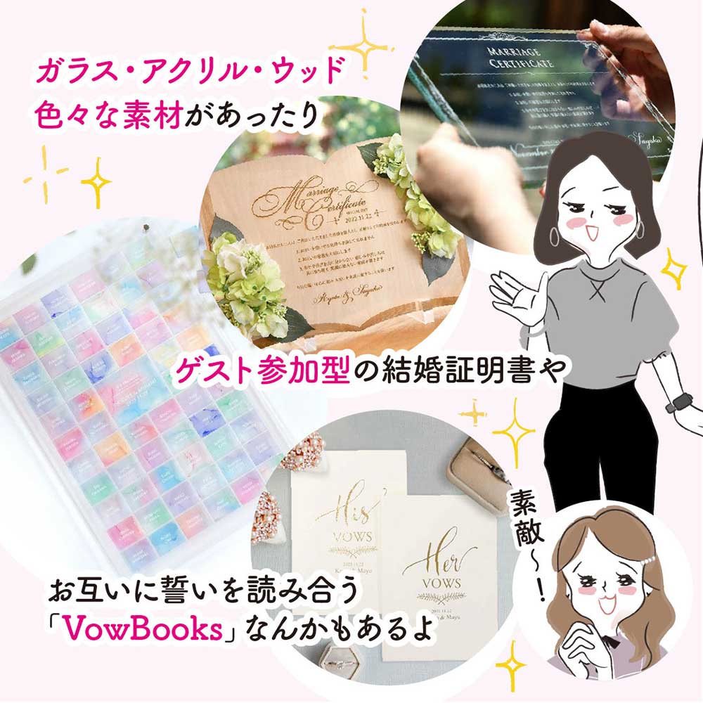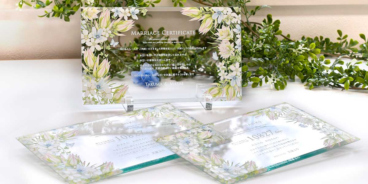 例えば、結婚証明書の素材の部分だけで考えても、定番のペーパータイプ以外に、アクリルやガラス、ウッドボードなどのアイテムも増えています。