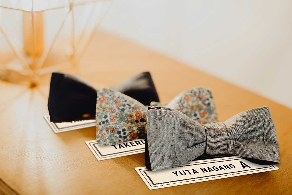 ロゼットや蝶ネクタイ、ヘアアクセサリーなど、当日パーティでゲストに身に着けて過ごしてもらいたいアイテムを一緒に準備しておくアイデアです。接触を避ける意味で、プチギフトを手渡しするリスクも回避でき、当日を楽しむアイテムにもなるため、一石二鳥以上の効果も!