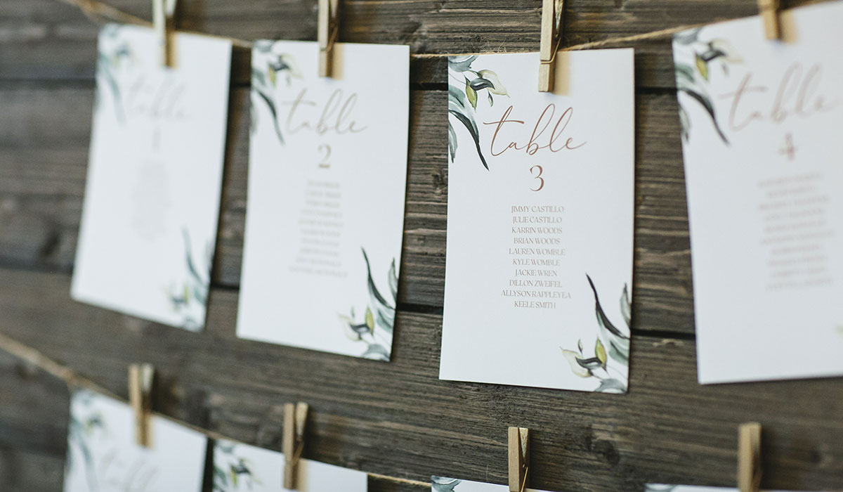 エスコートカードは、その名の通りゲストを席までエスコートするために使われるカードのこと。カードには、ゲストのお名前と着席するテーブル名を記載しておき、受付やウェルカムスペースにカードを並べておきます。