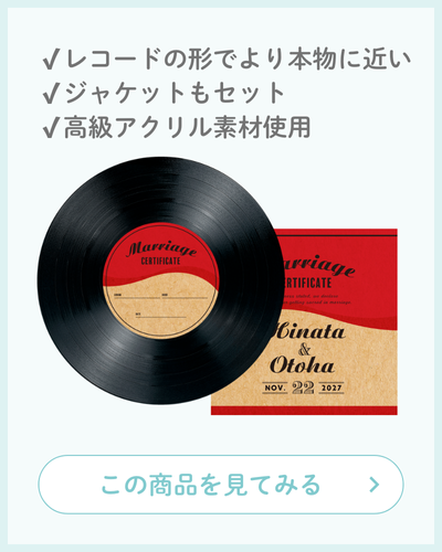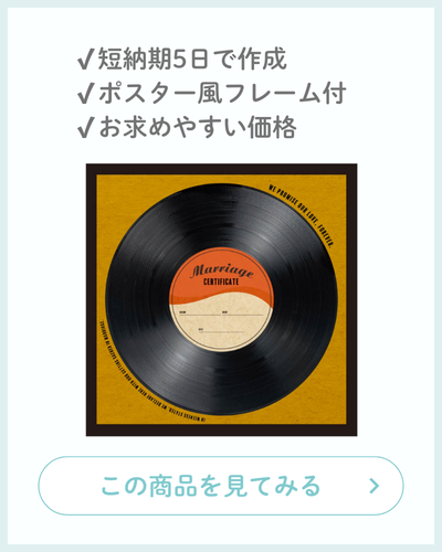 自筆のサインタイプなら、おしゃれなレコード型の結婚証明書が今、大注目。ゴールドやホワイトなど好きな色のペンを用意してレコード風のシートにサインをしていただくというもの。
