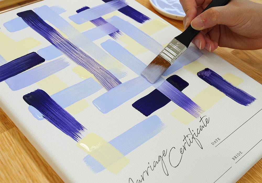 ウェディングキャンバスは、最近SNSで話題となっているゲスト参加型演出のひとつ。白いキャンバスに、意味を持たせた指定カラーの中からゲストがコレ!と思う色を選んで線を引くというもの。先ほどのサンドアートのペイント版のようなイメージで、こちらもゲスト参加型の結婚証明書として使えます。