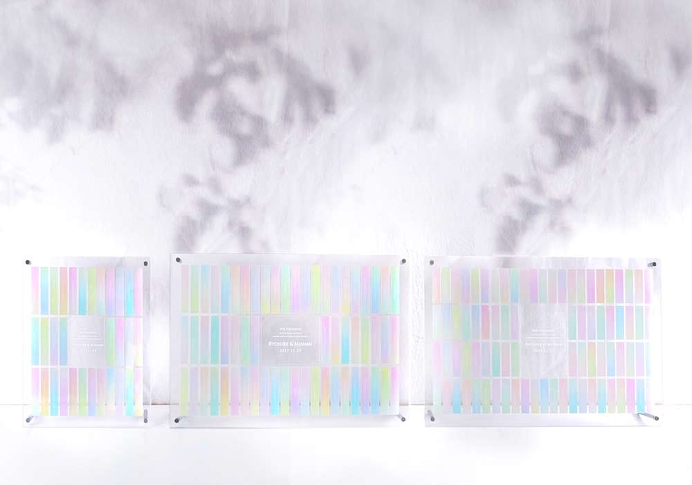 縦や横に折り重なる線や、どの色をゲストが選ぶかによって仕上がりが変わるため、世界にひとつだけのアートに仕上がること間違いなし!結婚式後は新居のインテアリアとして最高の思い出をずーっとそばに飾れるのもうれしいポイントです。