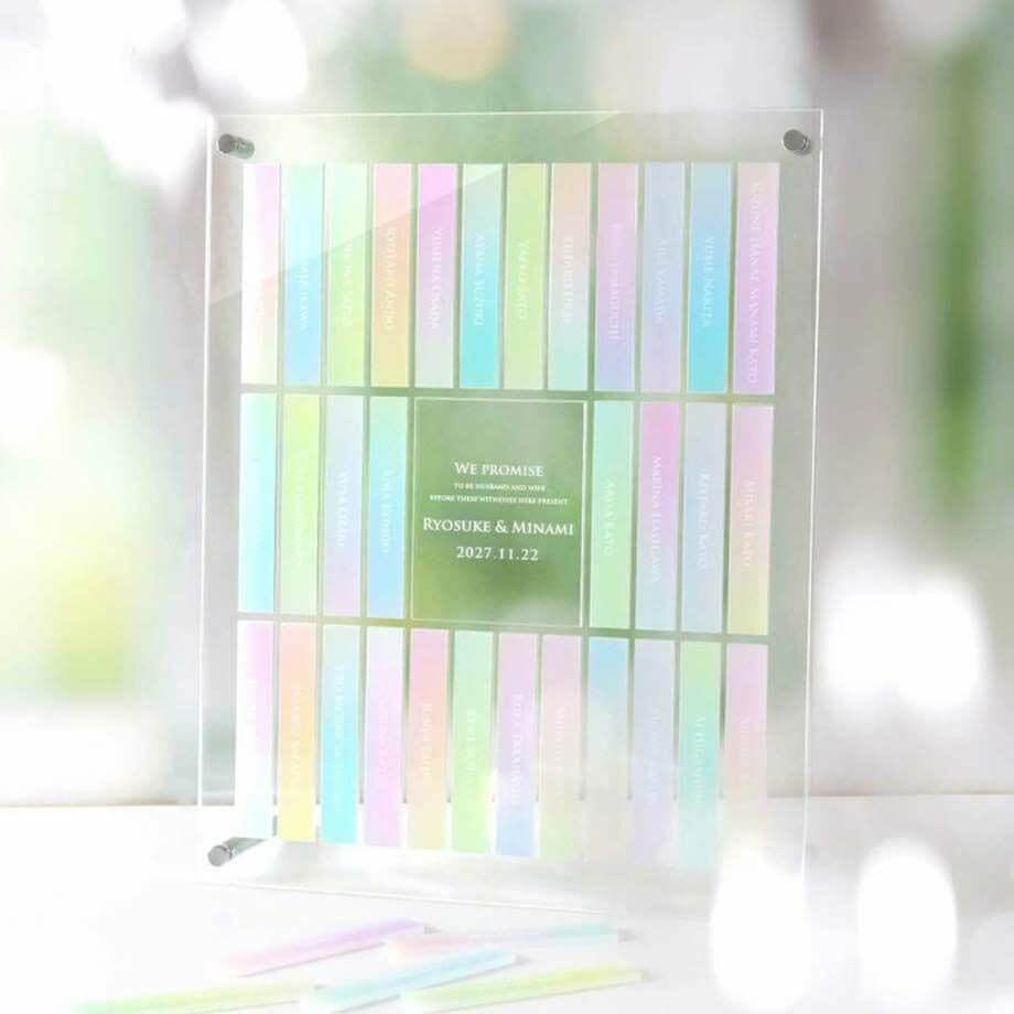 ミルキーカラーのグラデーション×縦長のアクリルピースで、可愛いとスタイリッシュを兼ね備えたデザインも。式後も新居にずっと飾りたくなるインテリア映えアイテムです。