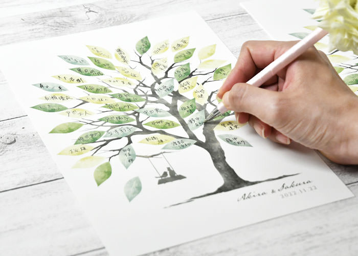 木の枝の部分に、ゲストの指紋やスタンプを押して、ウェディングツリーを完成させていただくという演出。指紋を押すのに抵抗がある、指が汚れるのがちょっといや…という方もいらっしゃると思うので、ツリーの中に自筆のサインをいれていただいて完成させるゲスト参加型アイテムもオススメです。