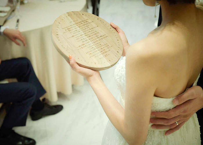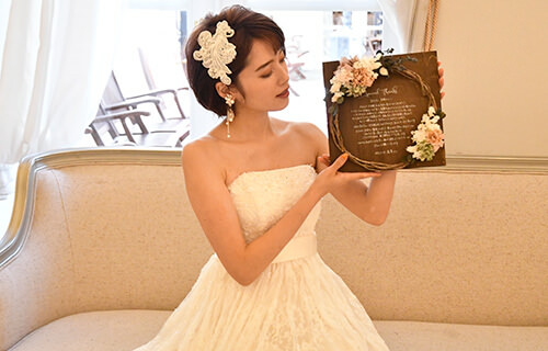 お手紙の面は、木製のボードに直筆のお手紙をレーザー刻印。さらにその裏面はお花をアレンジして、手紙を読む花嫁の姿をいっそう美しく引き立ててます。裏も表も主役にした花嫁の手紙です。