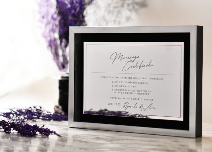 またフォーマットに決まりのない結婚証明書なら、二人らしい結婚の誓いをすることができます。自分たちが考えた宣誓文をゲストの前で読み上げたり、ゲストにも証人としてサインしていただくゲスト参加型など、世界に一つだけのオリジナルの結婚証明書が作れるのです。
