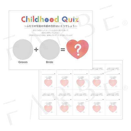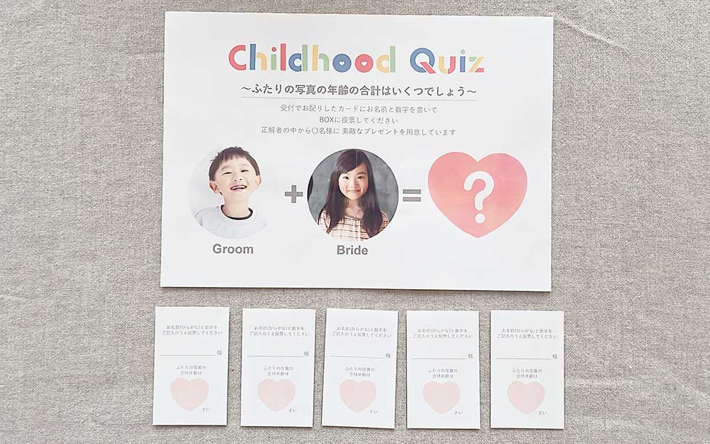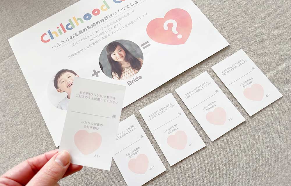 例えば、新郎新婦の子ども時代の写真はどれかを当てる、写真の年齢の合計年齢はいくつかを当てるなどがあります。