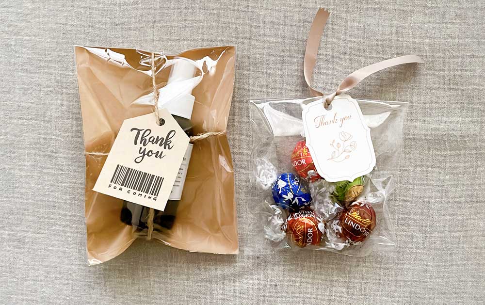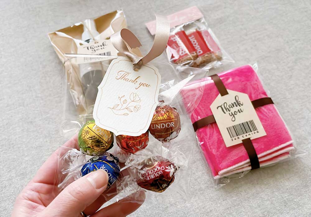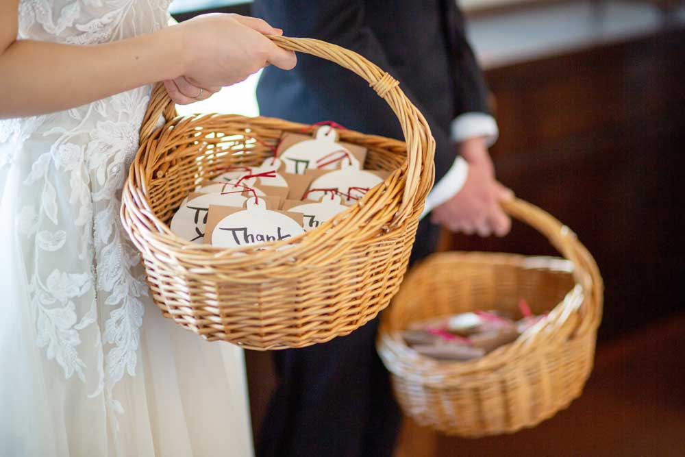 「サンキュータグ」とは、披露宴終了後のお見送りの際に渡すプチギフトにつける装飾のこと。