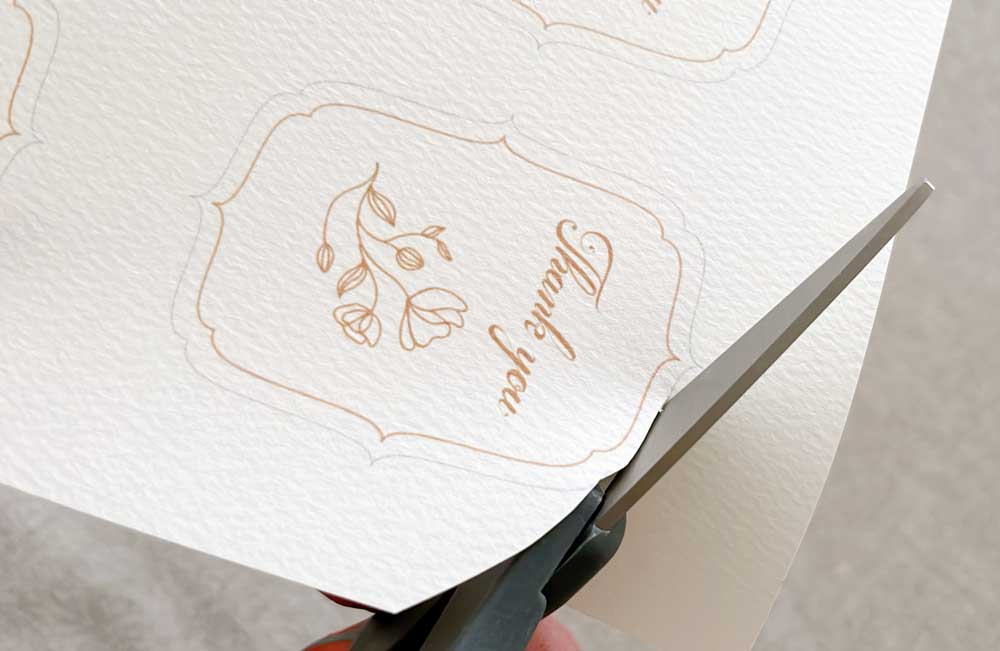印刷できたら、ハサミやカッターを使ってタグを切り分けていきます。このテンプレートでは、一枚のシートにつき9個分(横長の折り曲げるタイプは3個分)のThankyouタグが印刷できます。