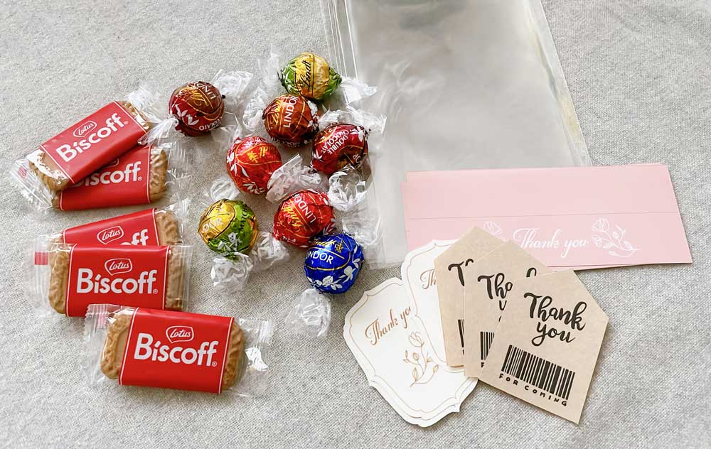 プチギフトをラッピングするための準備を整え、実際にラッピングしていきます。今回は結婚式プチギフトでも人気の「ロータスビスケット」「リンツリンドール」などをラッピングしてみましたよ♪美味しいお菓子はプチギフトとして渡しても喜ばれます(*´∀`*)