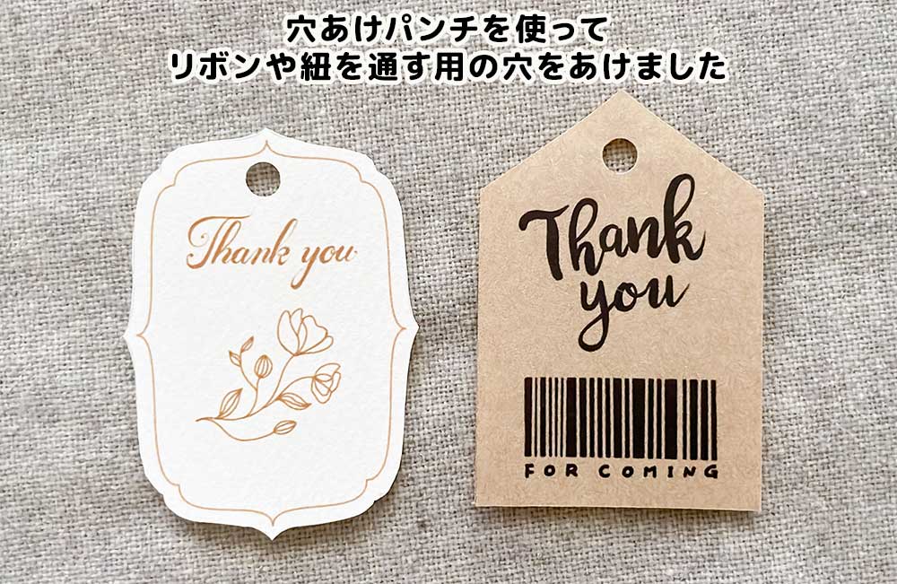 リボンや紐を通して使う場合は、穴あけパンチで1か所穴をあけて使ってみて。こんな感じです↓